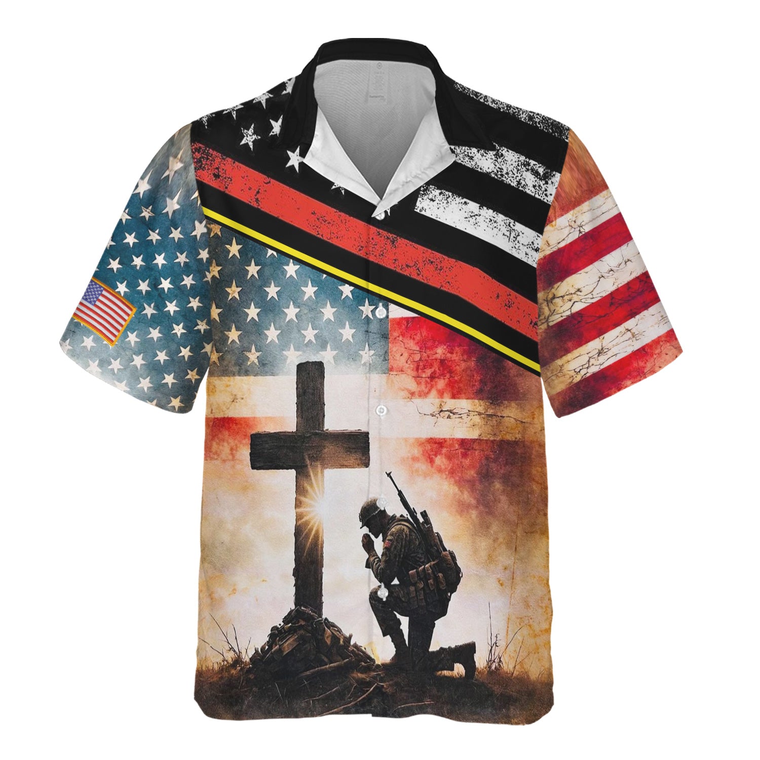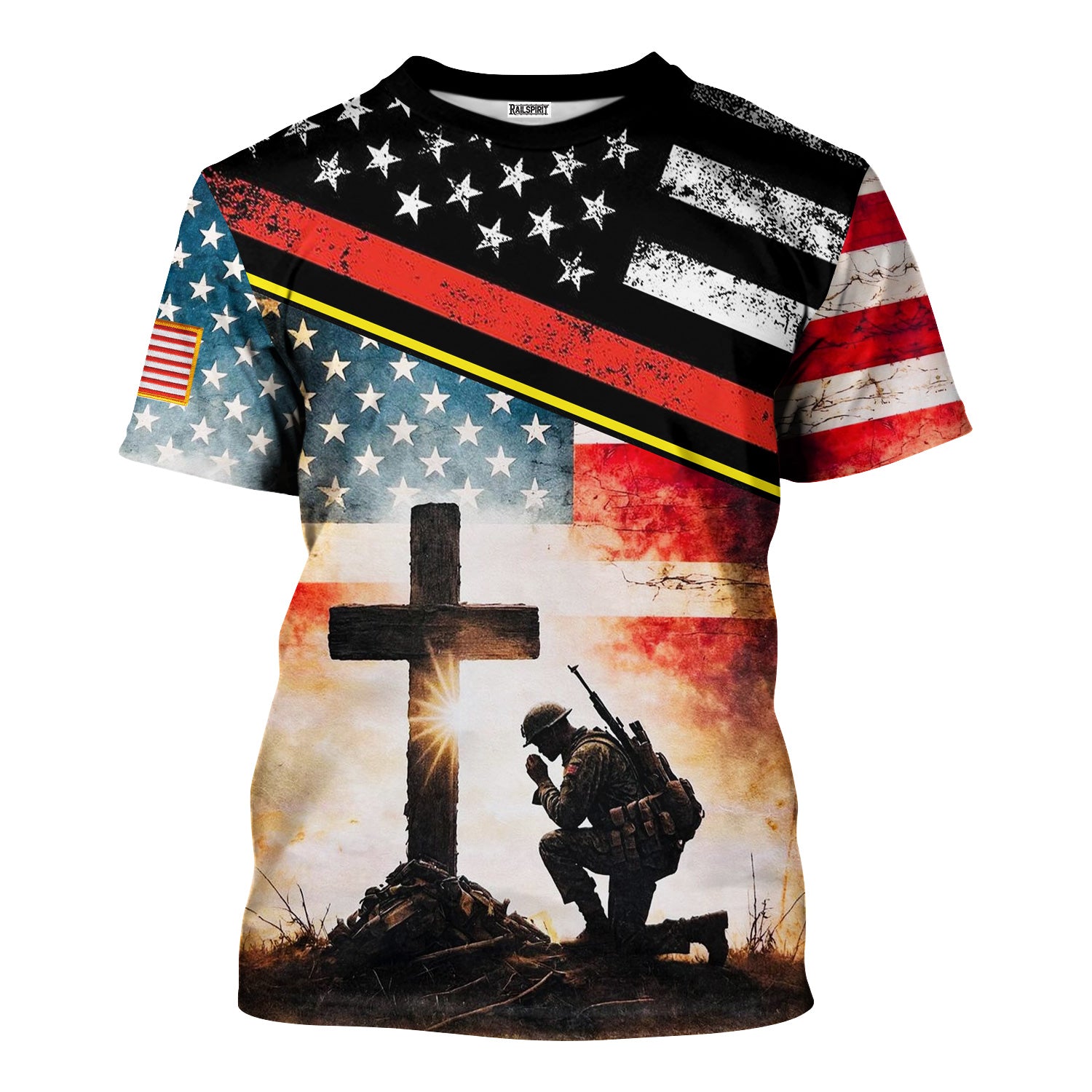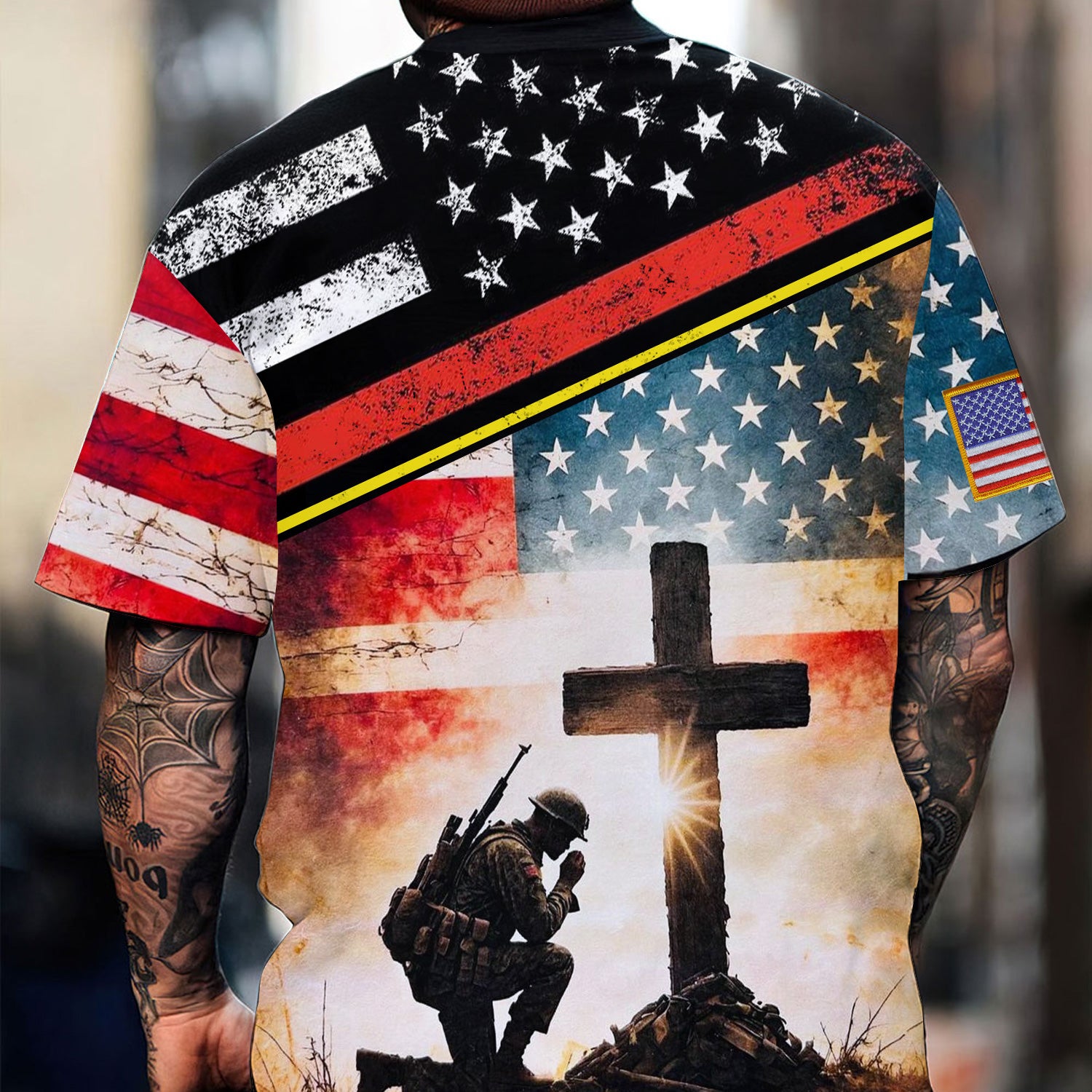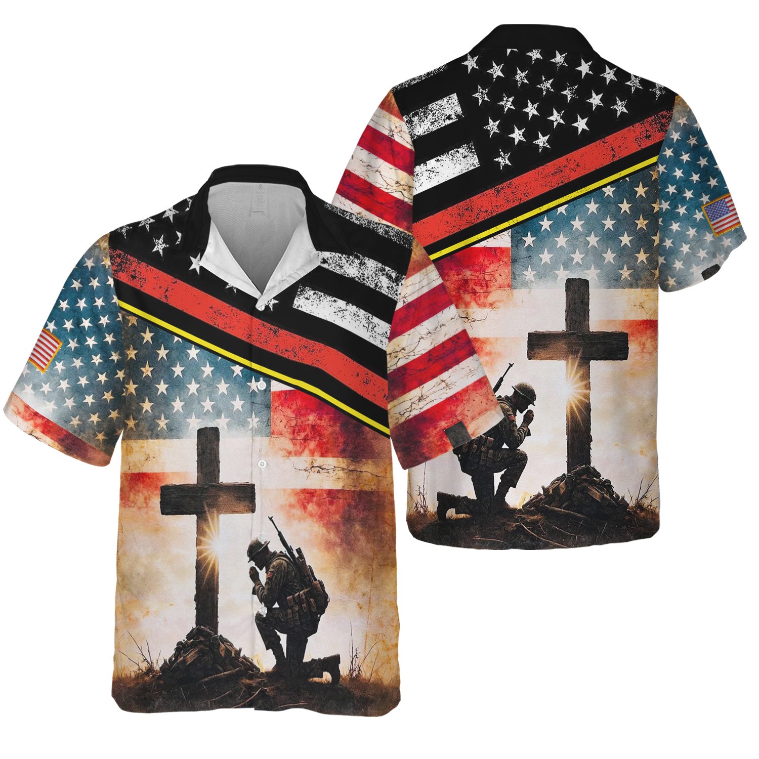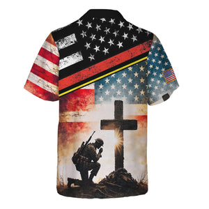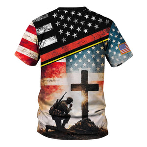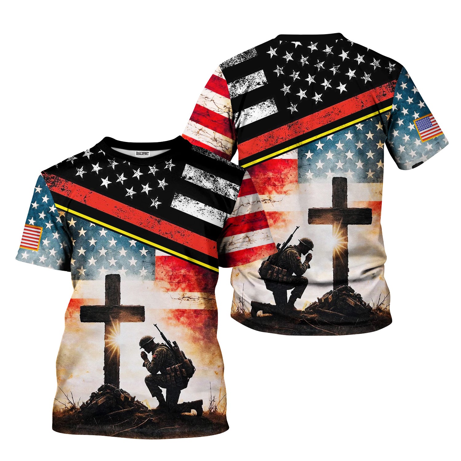 Christian Veteran Shirt, Soldier Kneeling at Cross American Flag Shirt, Patriotic Memorial Day Tee, Military Faith Gift for Men