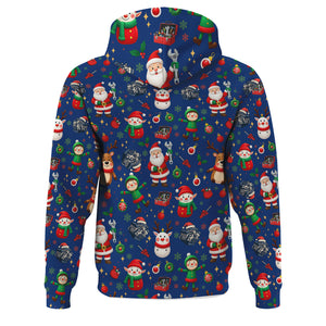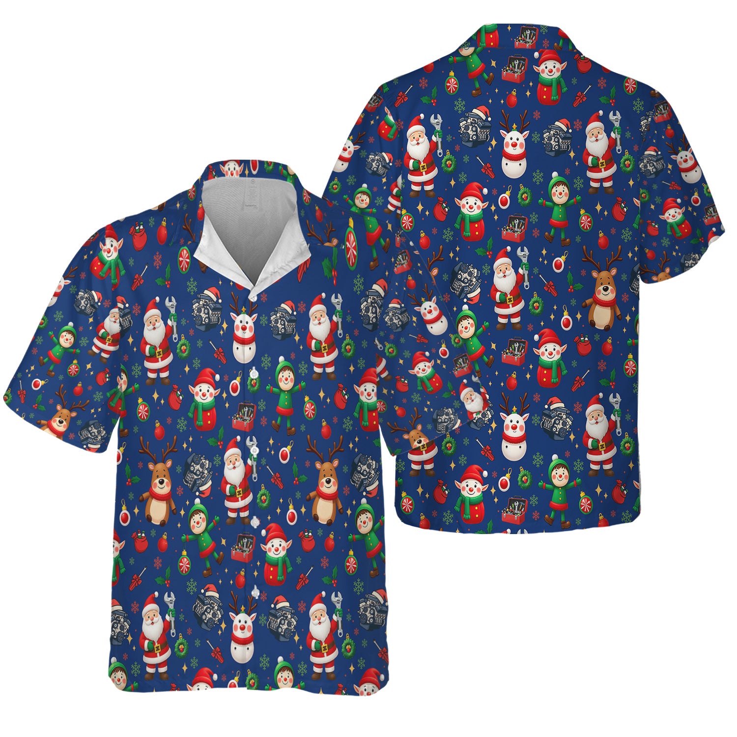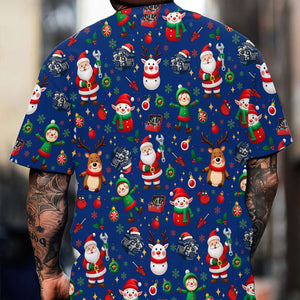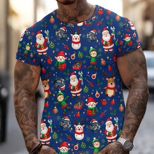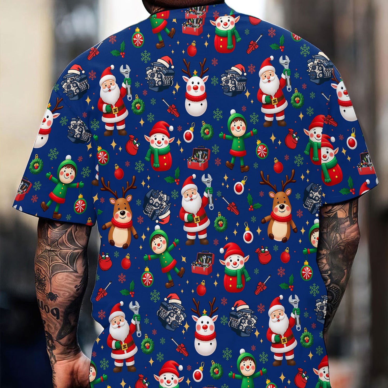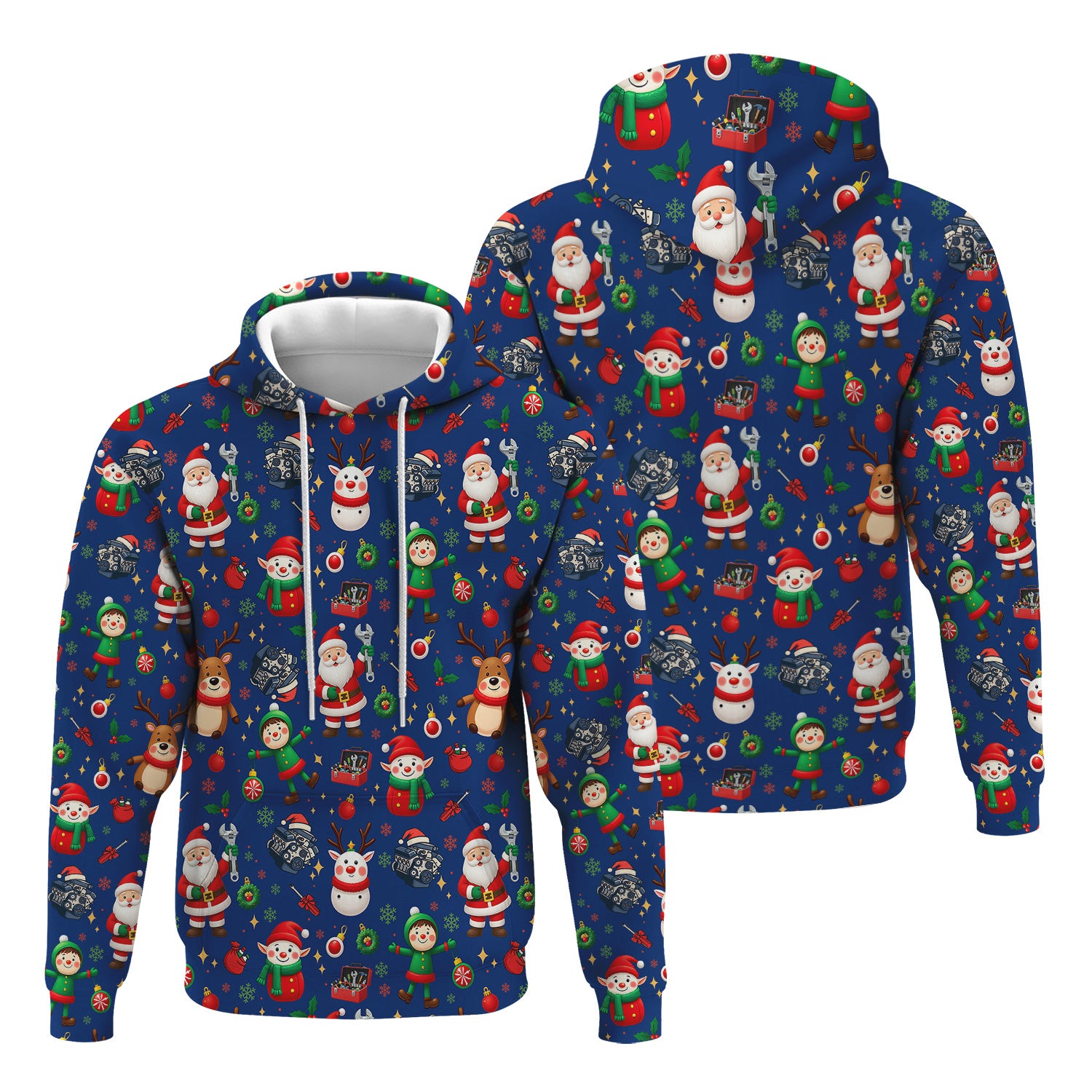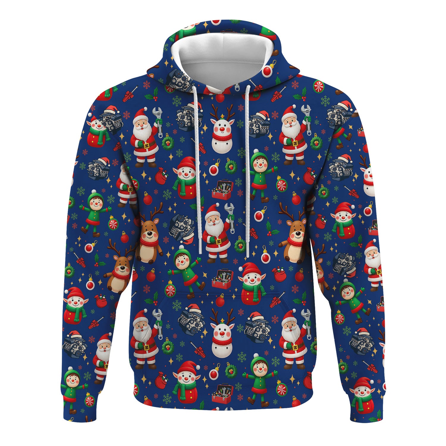 Christmas Mechanic All Over Print T-Shirt with Santa, Reindeer, Elves & Engine Tools, Festive Holiday Auto Mechanic Graphic Hoodie