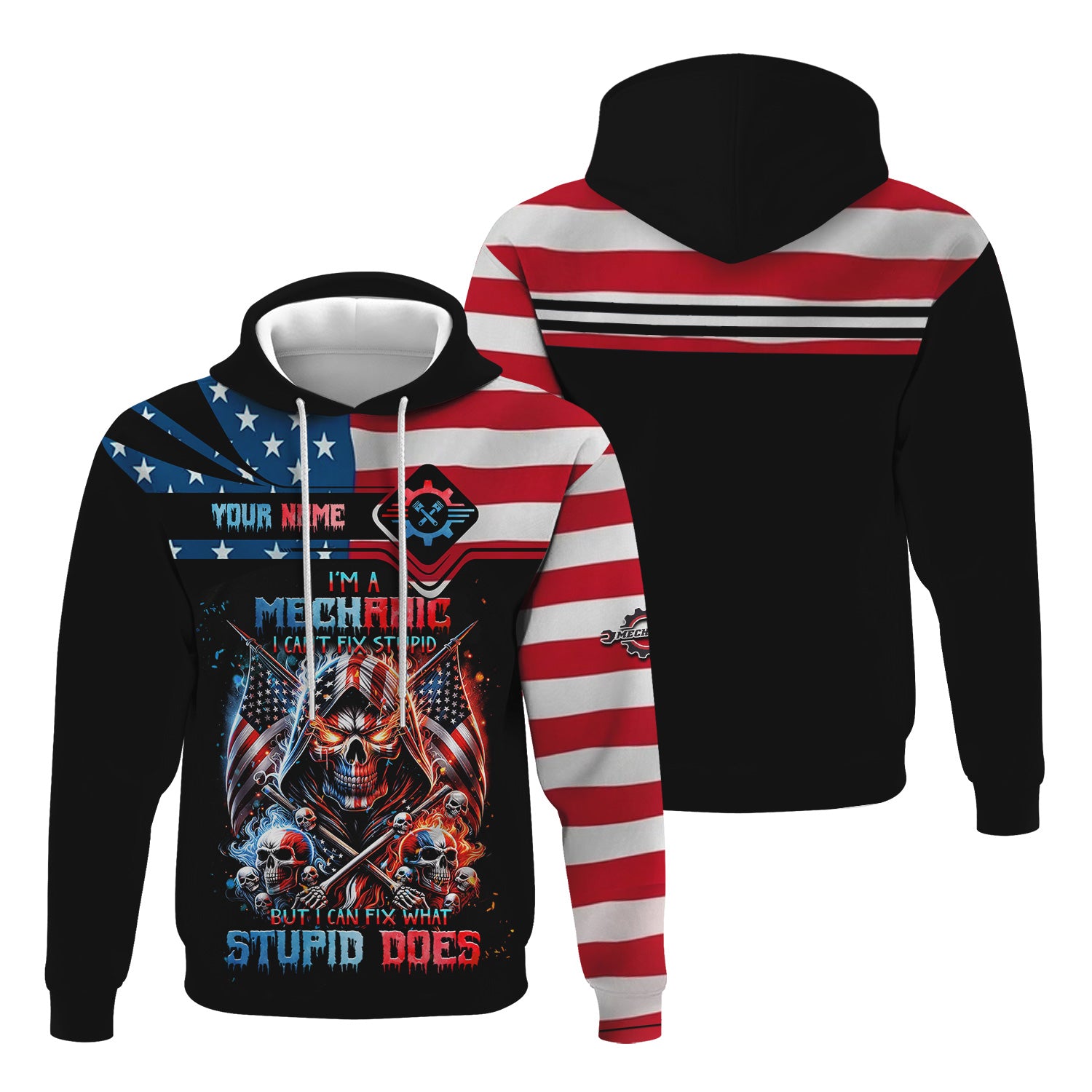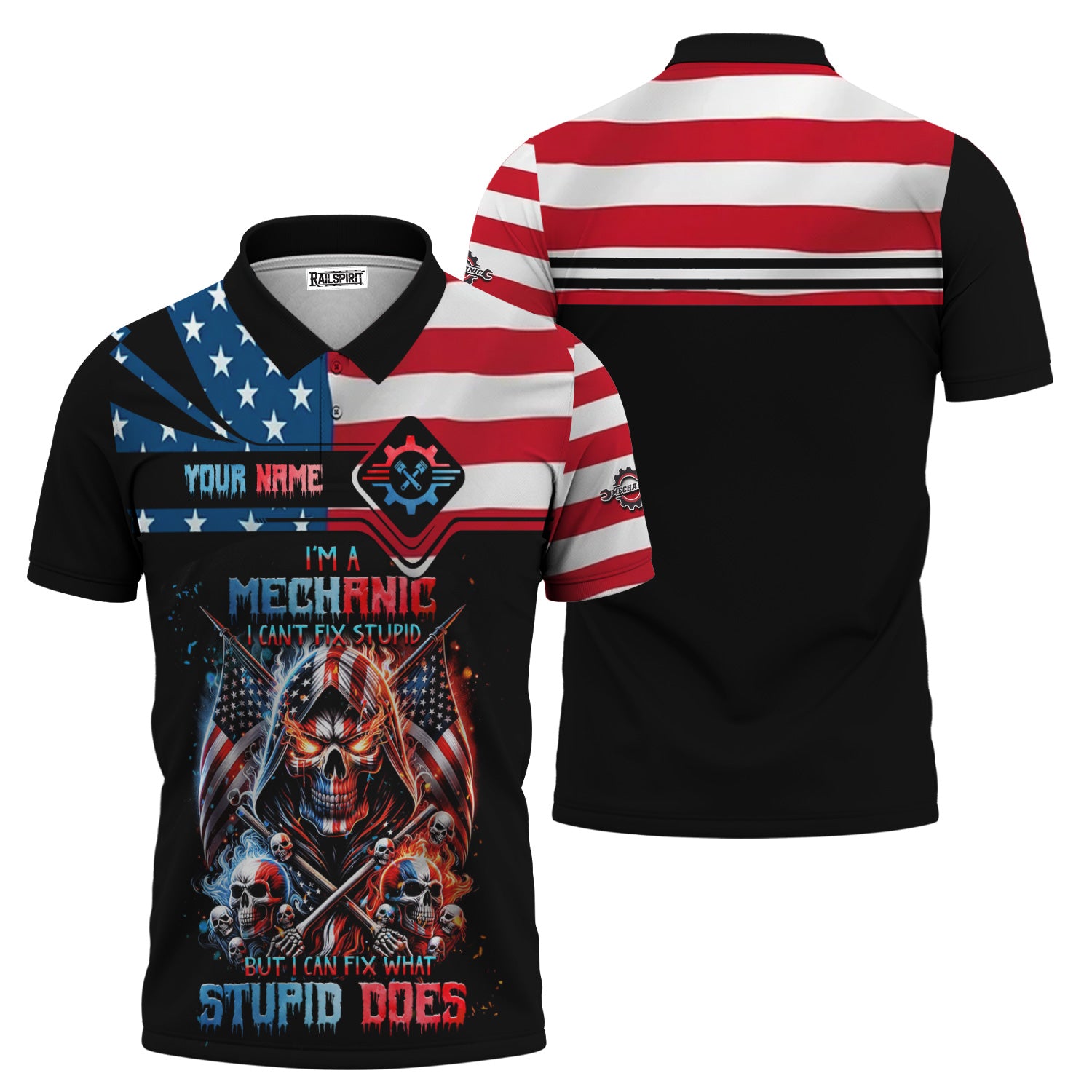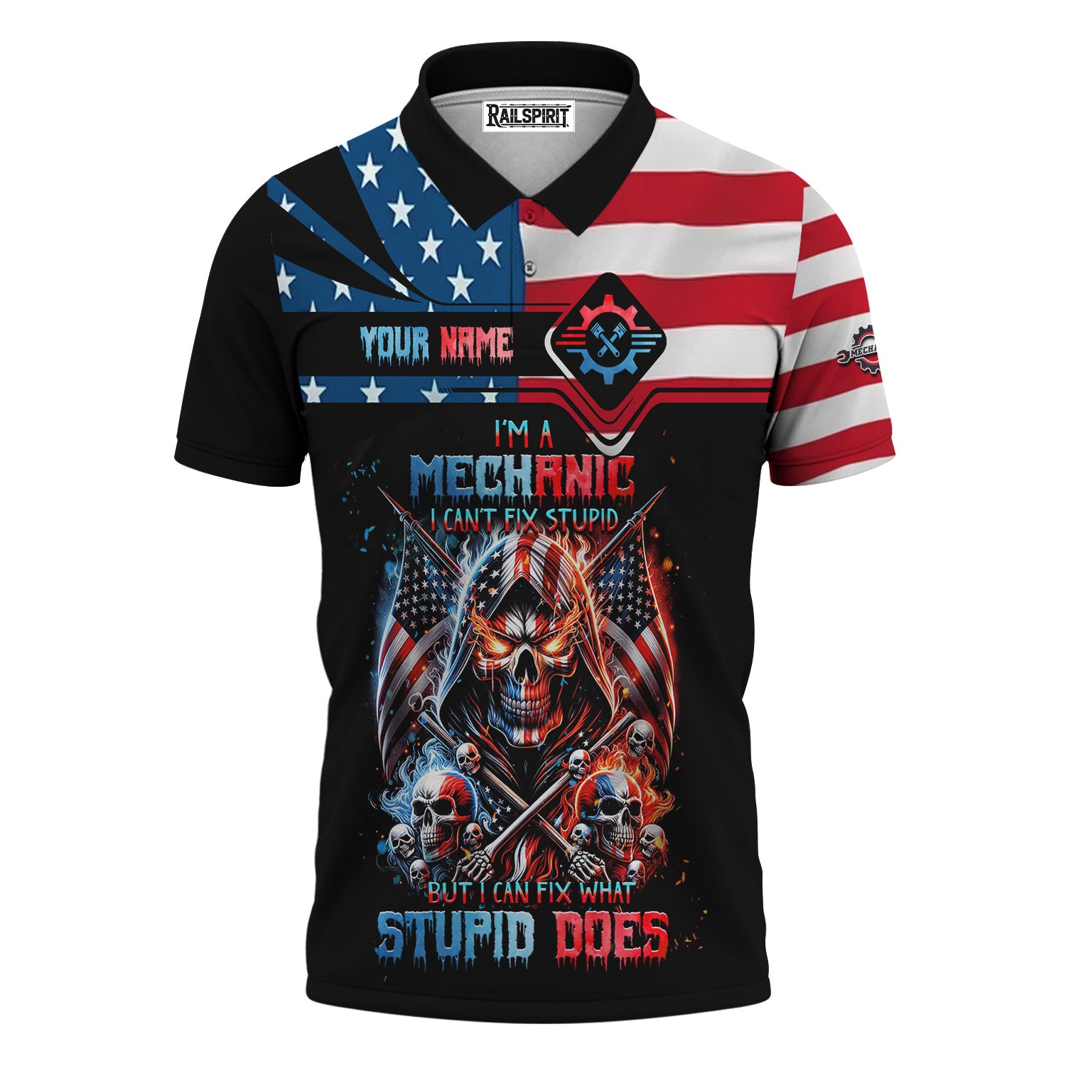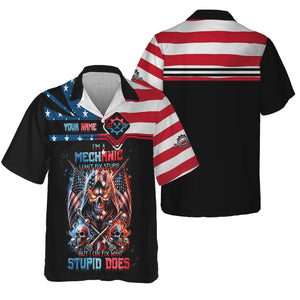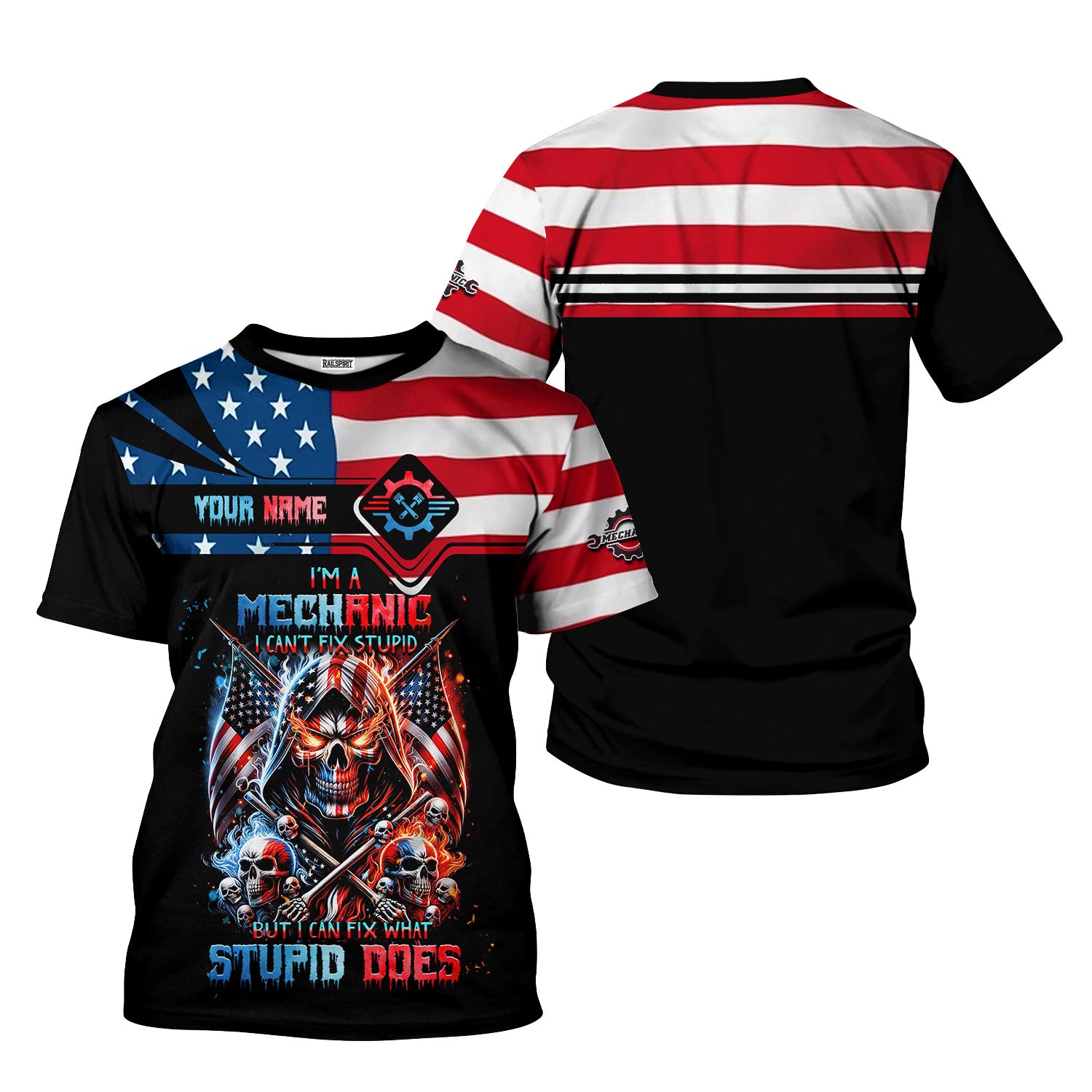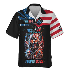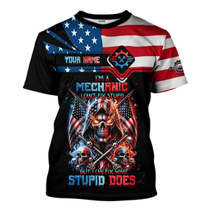Custom Mechanic Shirt, Fix Stupid Design, Personalized Name, American Flag Skull Graphic, Funny Mechanic T-shirt for Men & Women