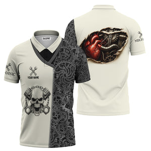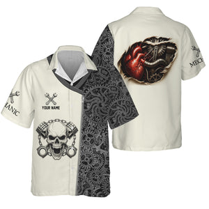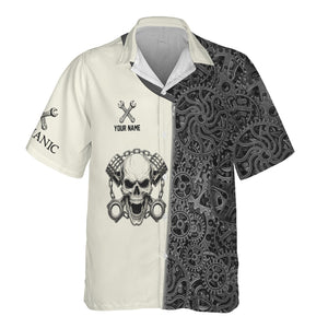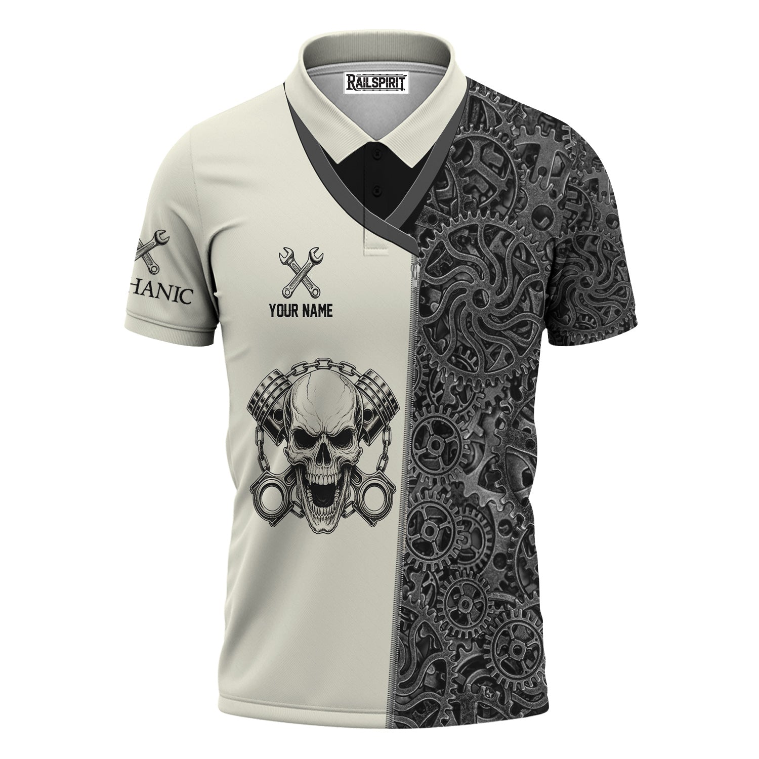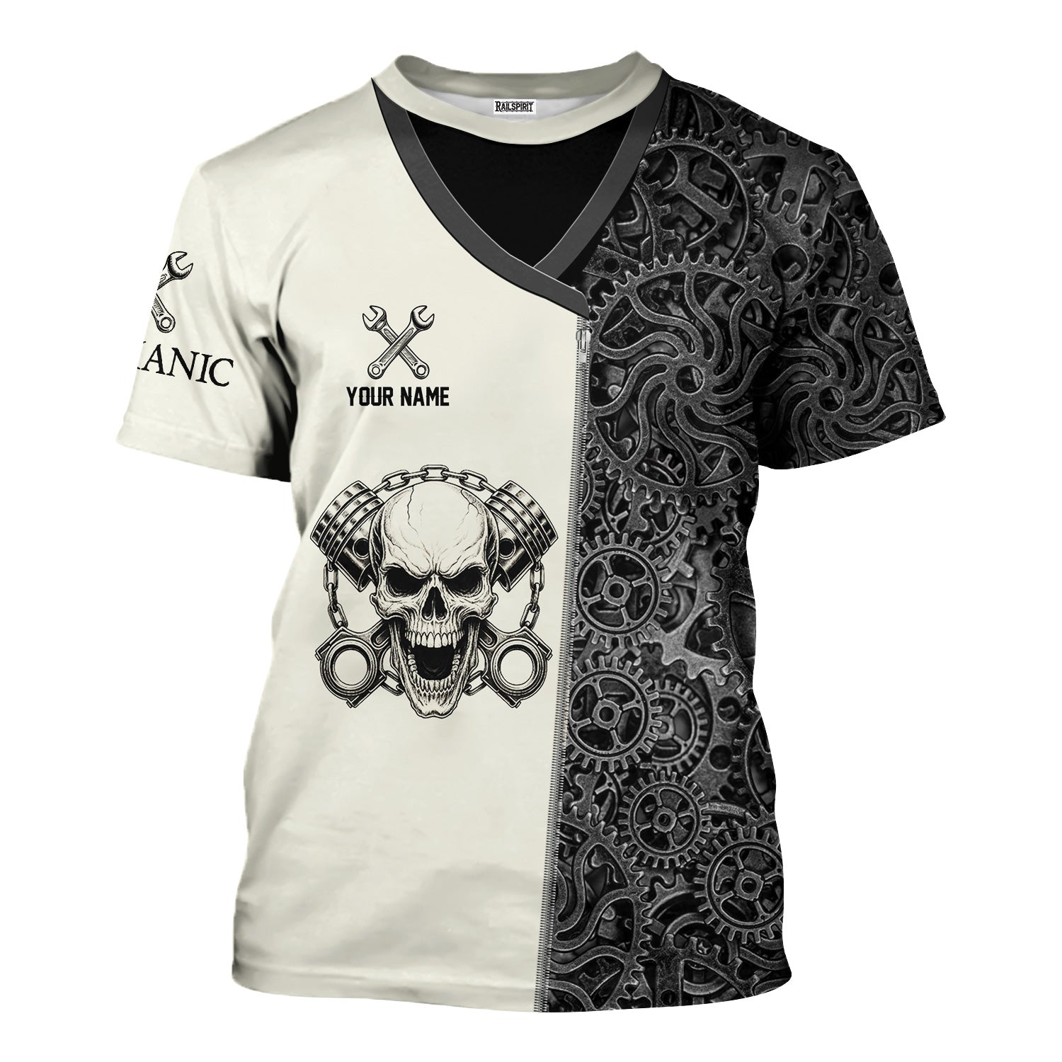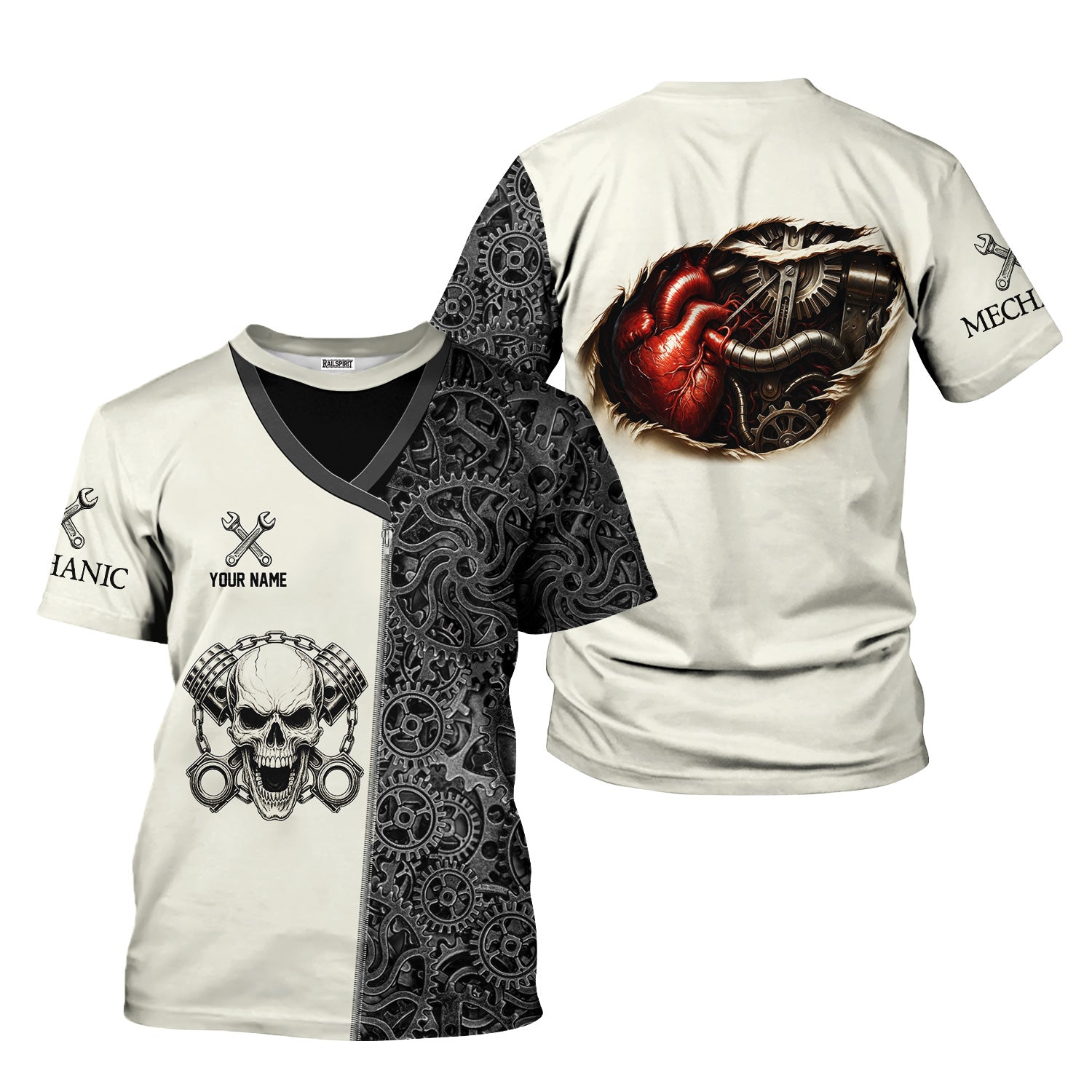 Custom Name Mechanic Shirt Skull with Engine Piston Design Gear Pattern T Shirt All Over Printed