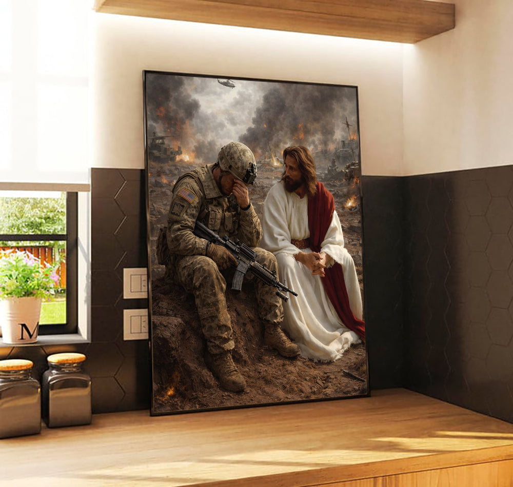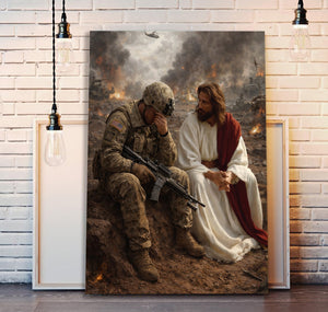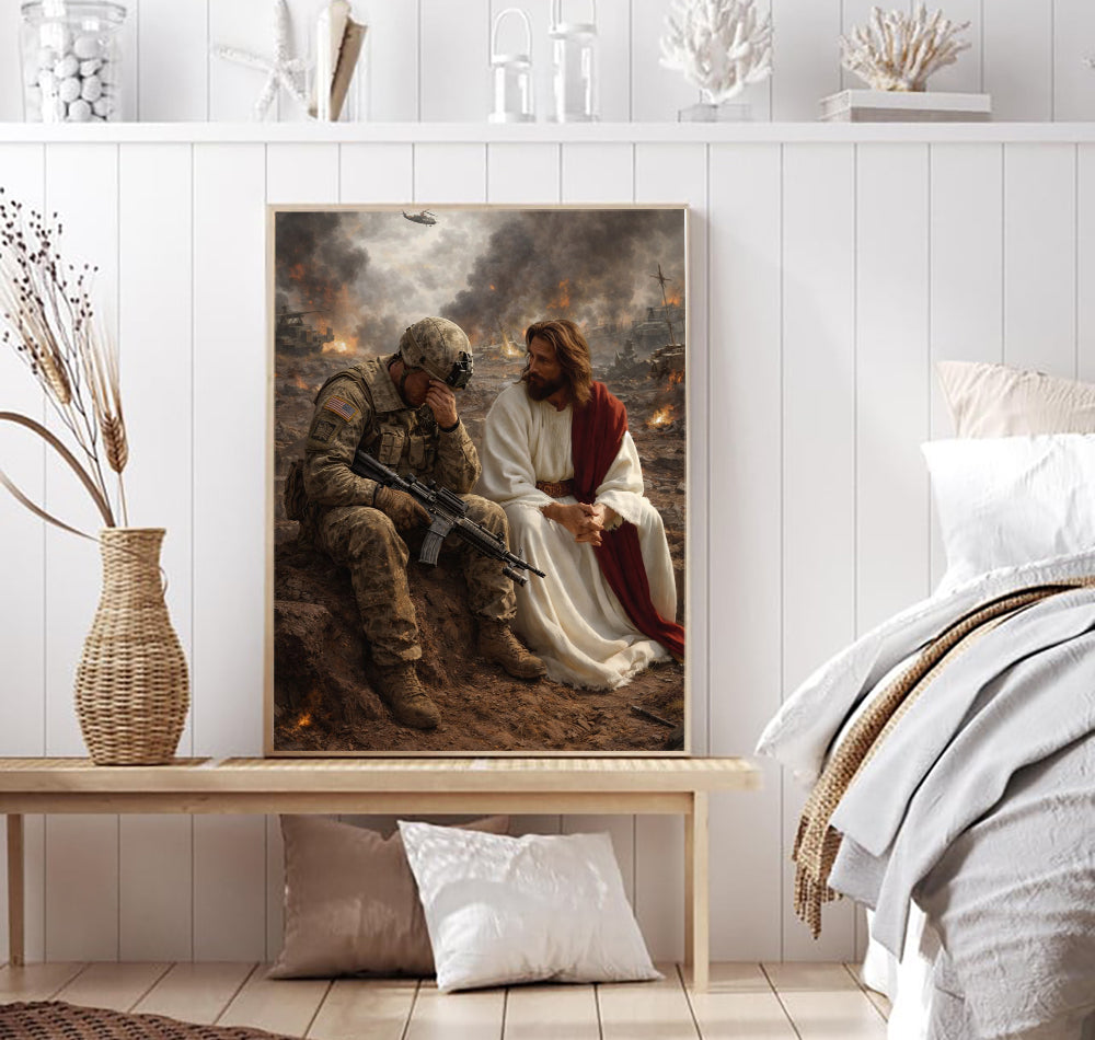 Jesus Beside Soldier Canvas Wall Art, Patriotic Military Decor, Courage Strength Warrior Print, Veteran Canvas Gift, Home Artwork Decor