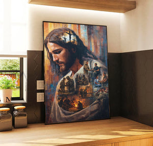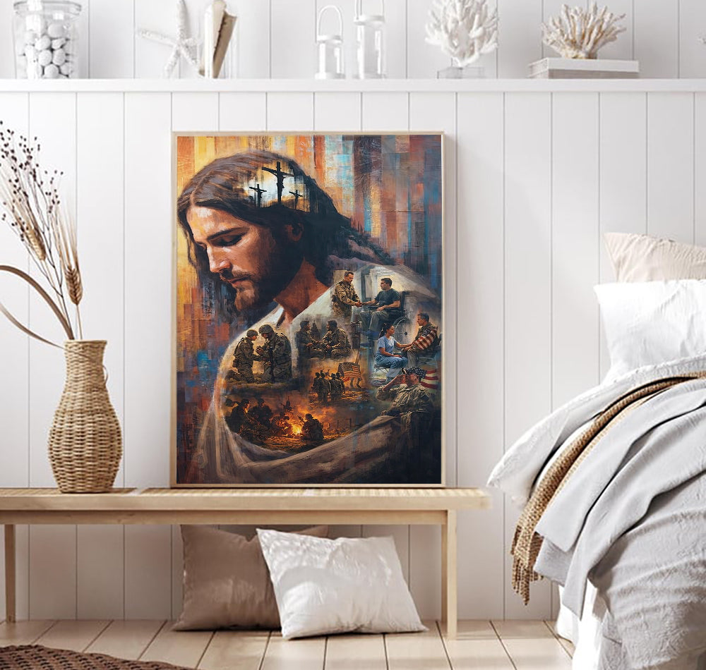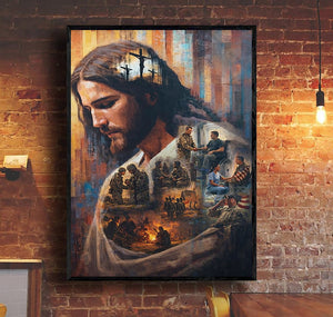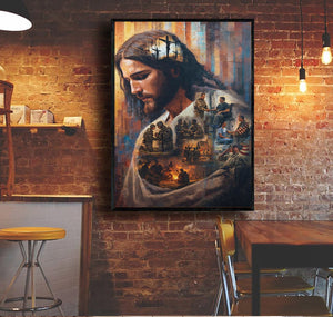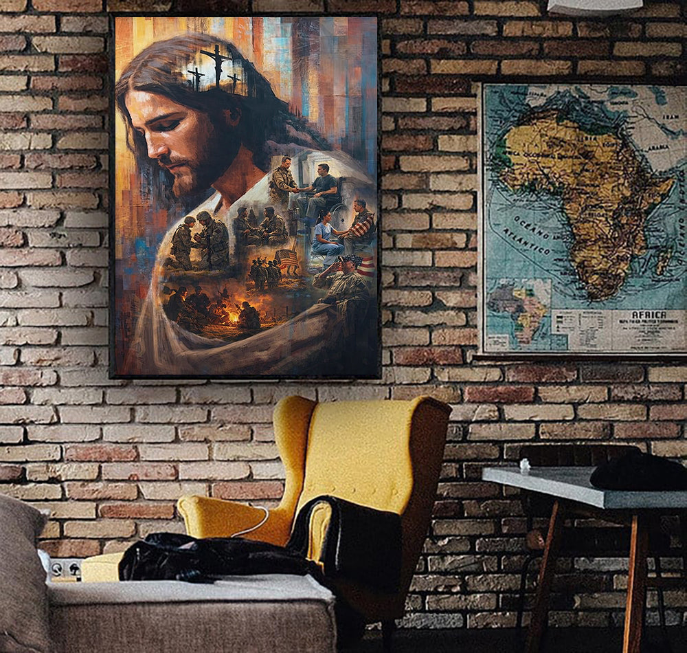 Jesus Christ Wall Art Canvas Print, Faith & Sacrifice Artwork, Christian Home Decor, Veteran Tribute Art, Spiritual Gift for Family
