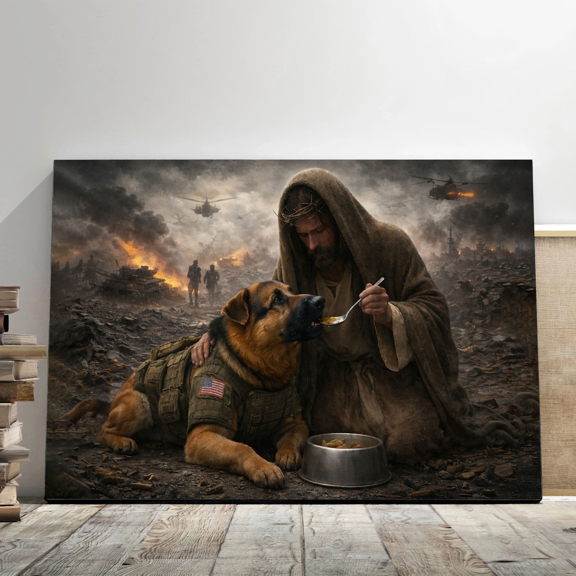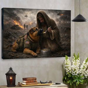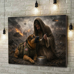 Jesus Feeds the Military Dog Canvas Wall Art, Christian Military Wall Art for Veterans, Faith Home Decor Gift