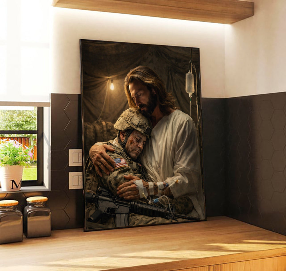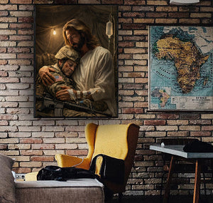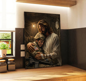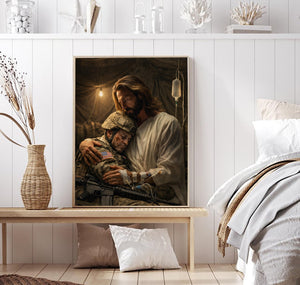 Jesus Holding a Soldier Canvas Wall Art, Christian Military Wall Art for Veterans, Faith Home Decor Gift