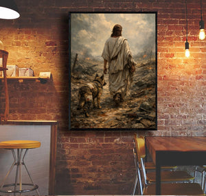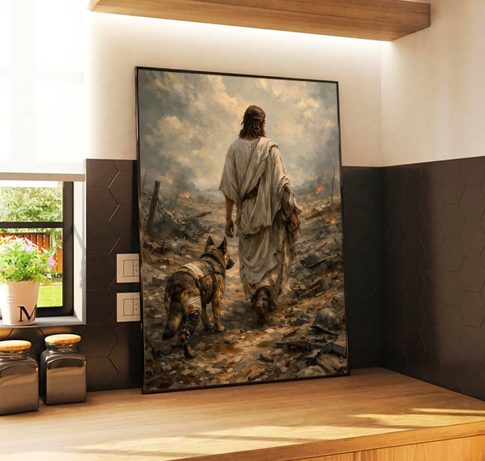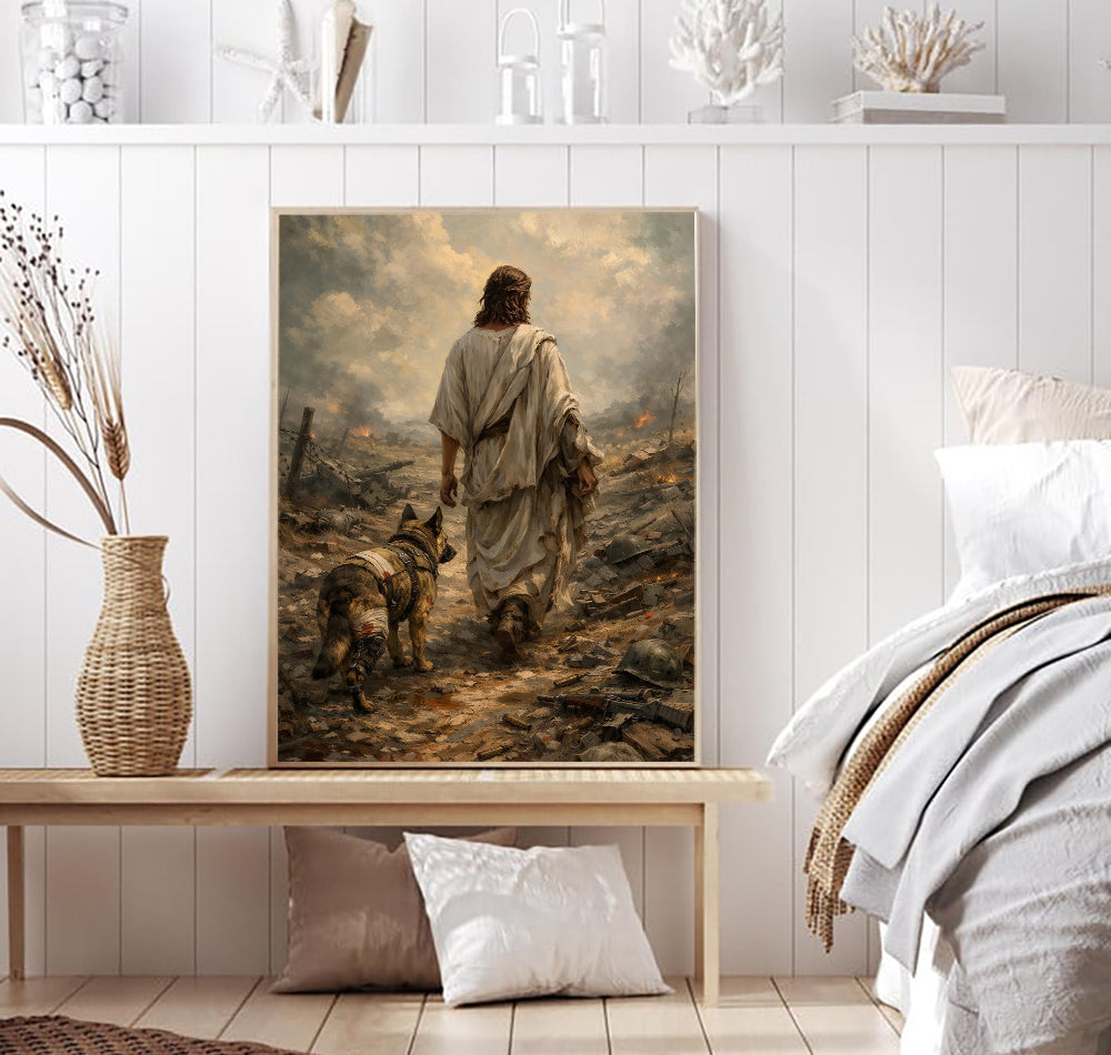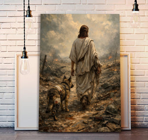 Jesus Walking with Military Dog Wall Art Canvas, Christian Veteran Canvas Print, Faith and Warrior Artwork, Patriotic Religious Decor, Soldier Tribute Gift