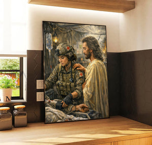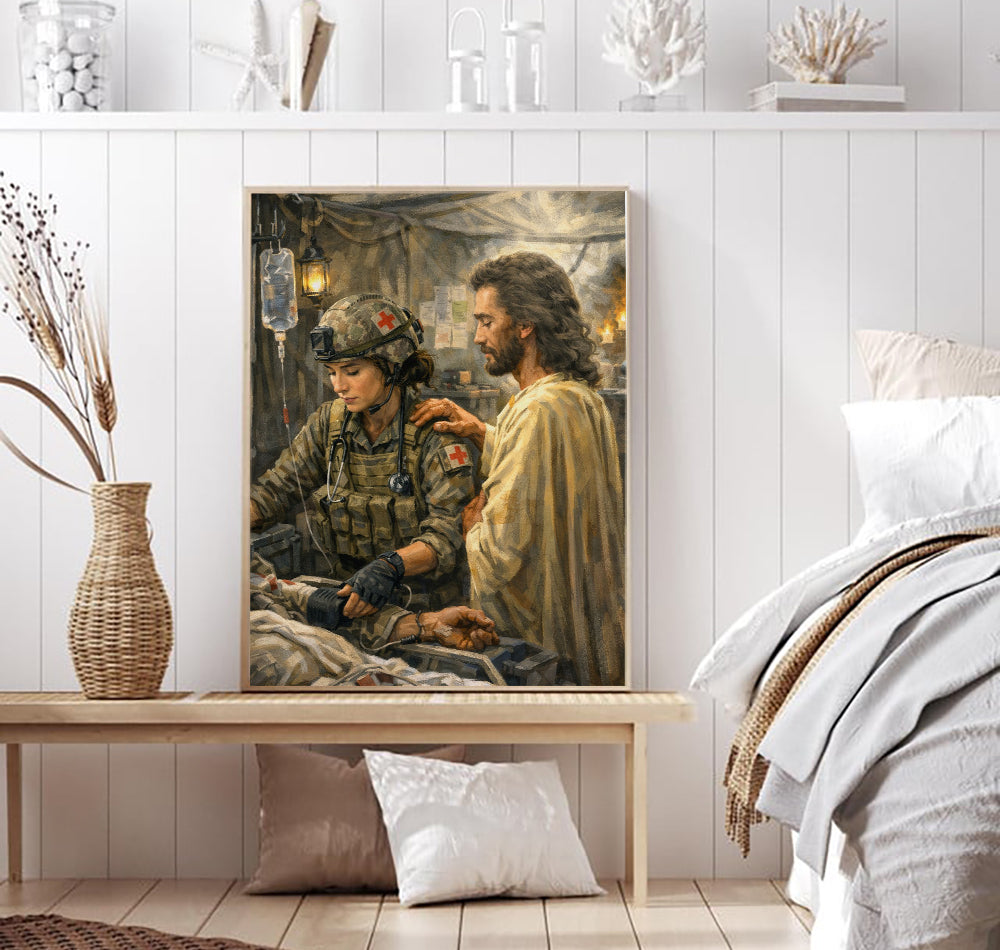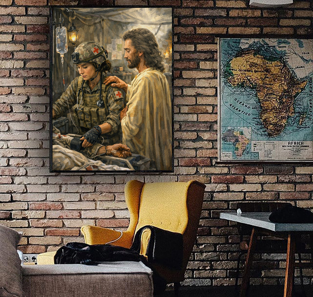 Jesus With Combat Medic Canvas Wall Art, Christian Military Wall Art for Veterans, Faith Home Decor Gift Idea