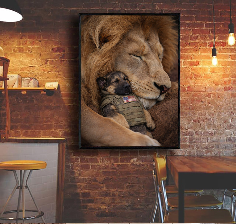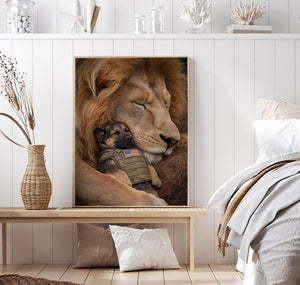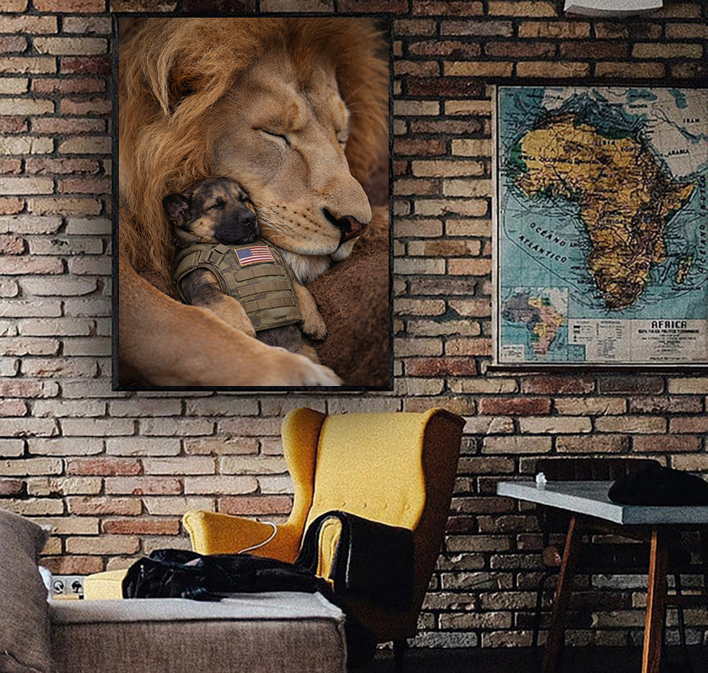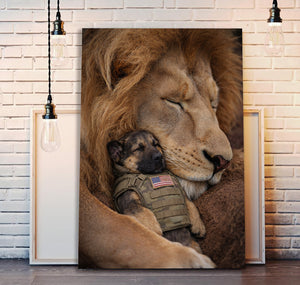 Lion and Military Puppy Wall Art Canvas, Patriotic Dog and Lion Poster, Veteran Tribute Animal Artwork, Guardian Lion Decor, Military Dog Lover Gift