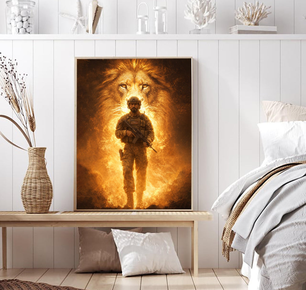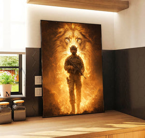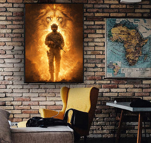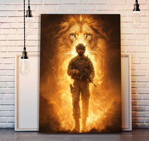 Lion of Judah Behind Soldier Canvas Jesus Canvas Wall Art, Christian Military Wall Art for Veterans, Faith Home Decor Gift