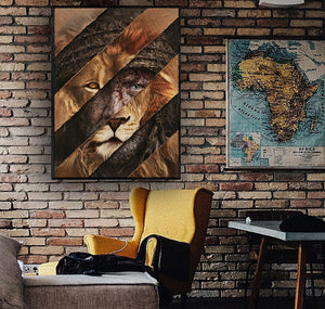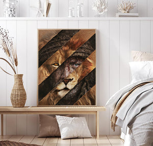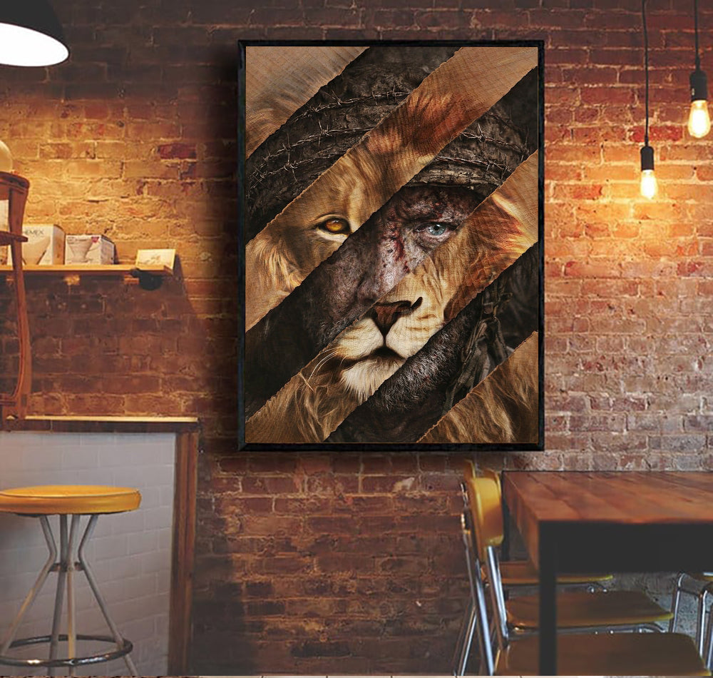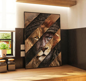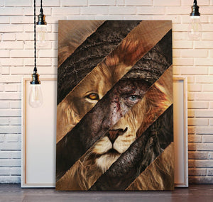 Lion Warrior Canvas Wall Art, Split Face Lion and Man Portrait Print, Masculine Rustic Decor, King of Judah Christian Gift Artwork