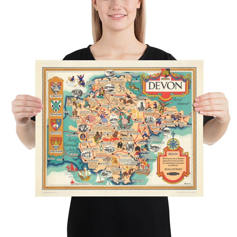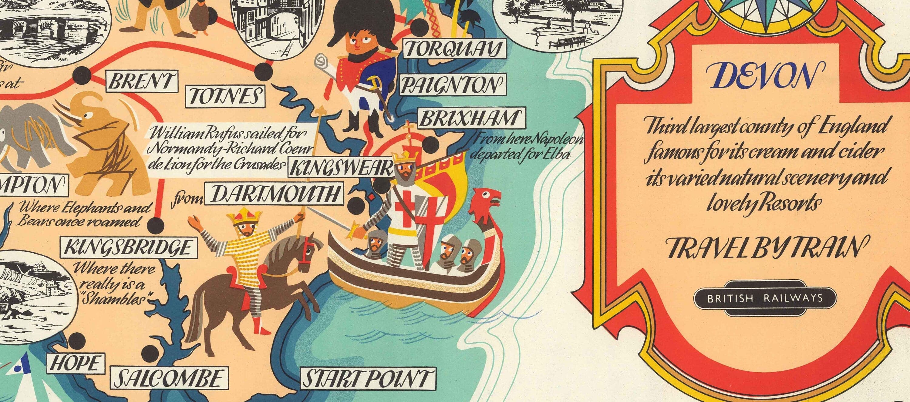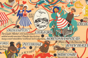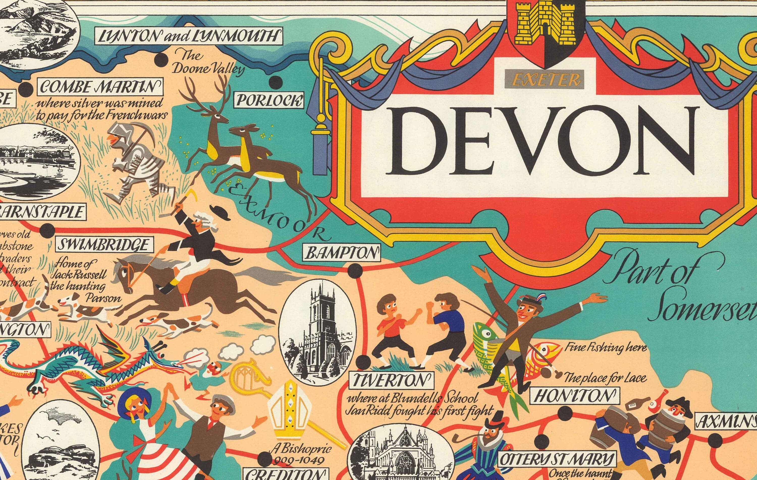 Old Pictorial Map of Devon, 1950 by Bowyer - British Railway, Torquay, Torrington, Clovelly, West Country
