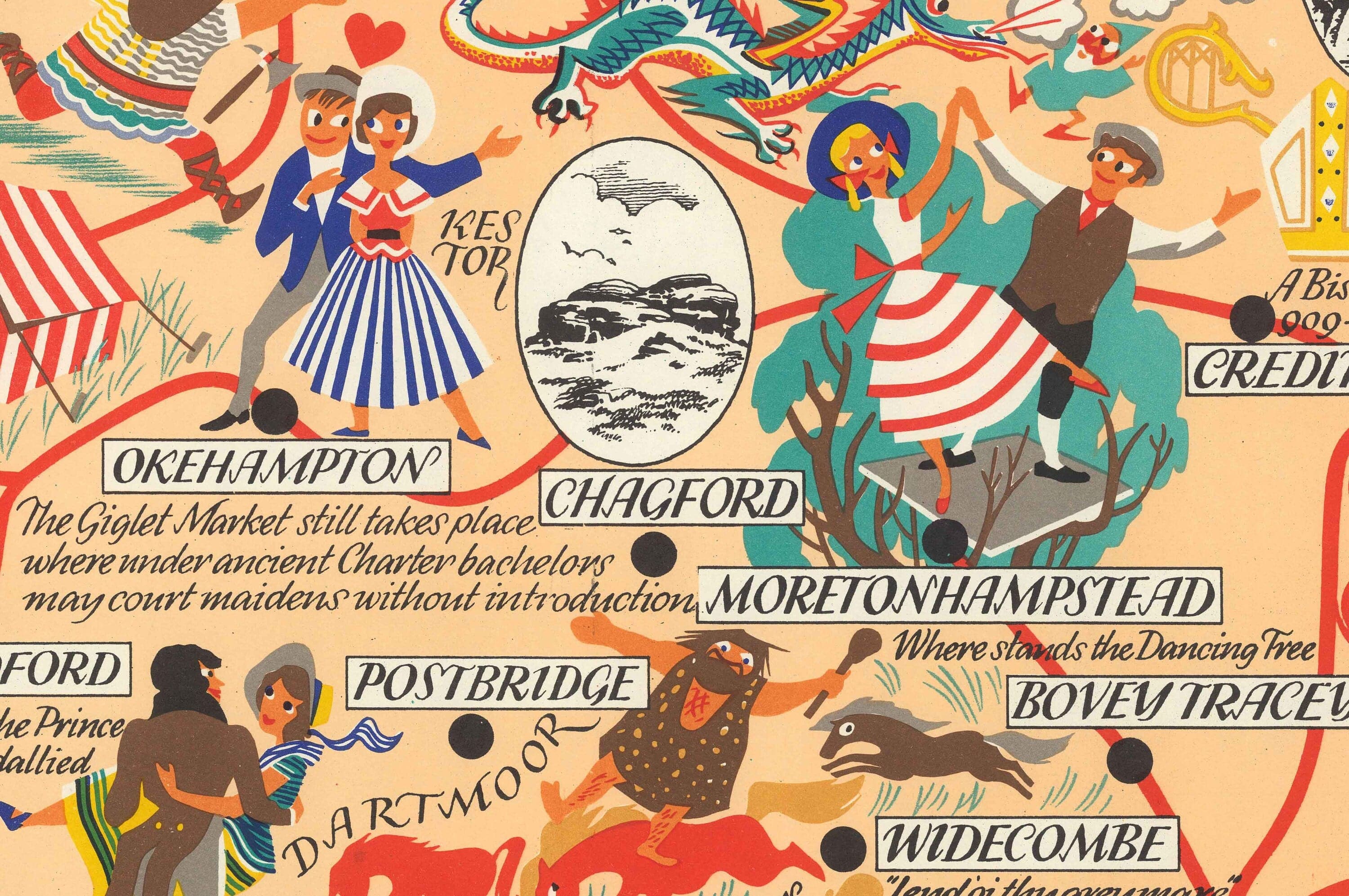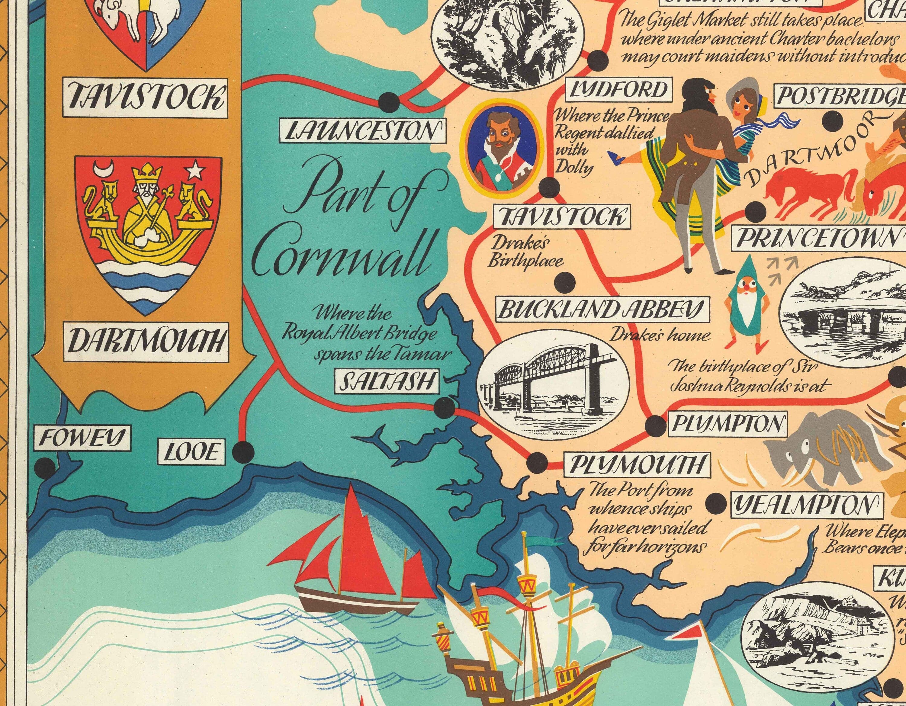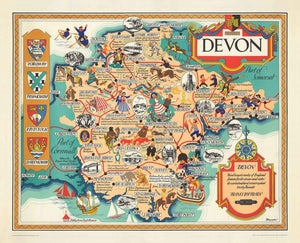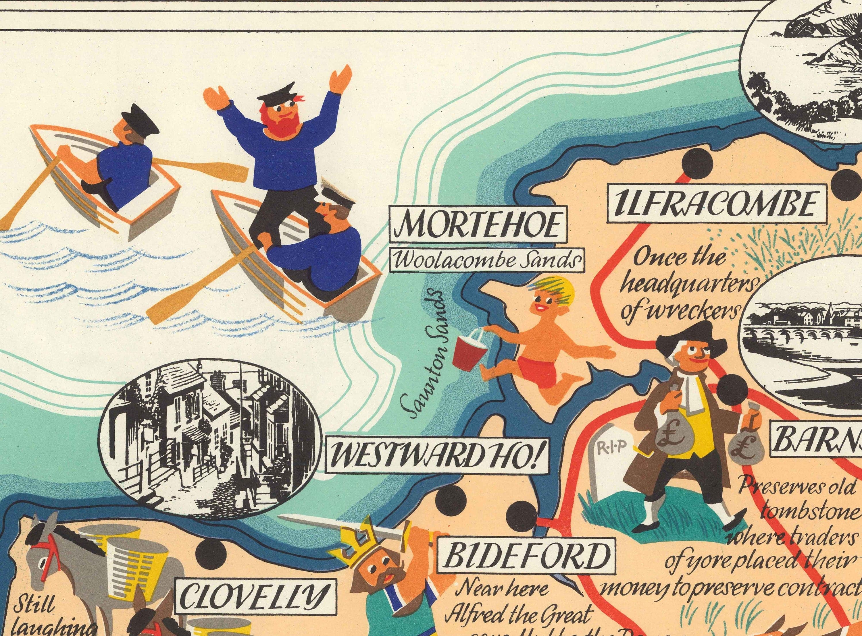 Old Pictorial Map of Devon, 1950 by Bowyer - British Railway, Torquay, Torrington, Clovelly, West Country