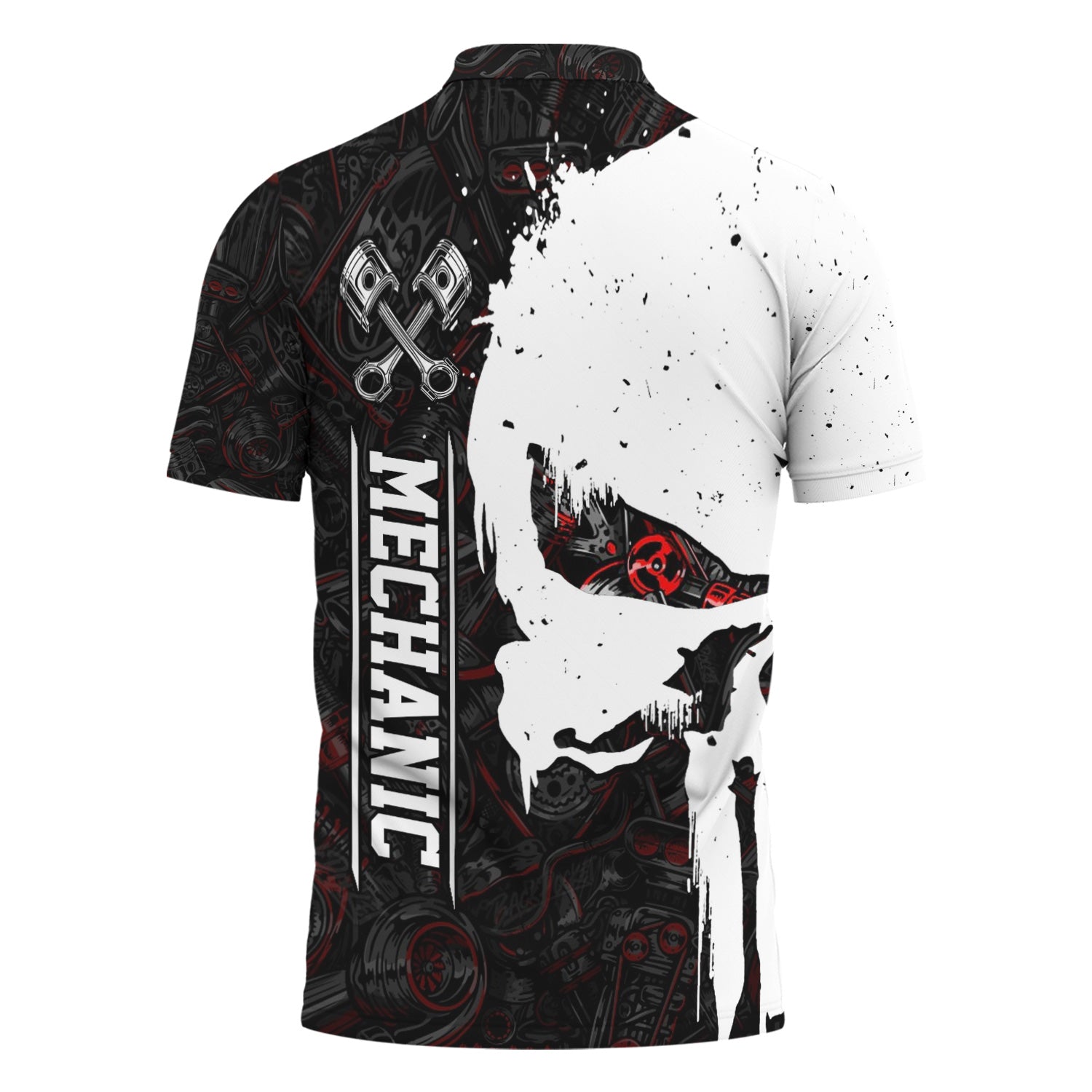 The print is awesome and the shirt fits just right. Perfect for any mechanic who loves bold style.