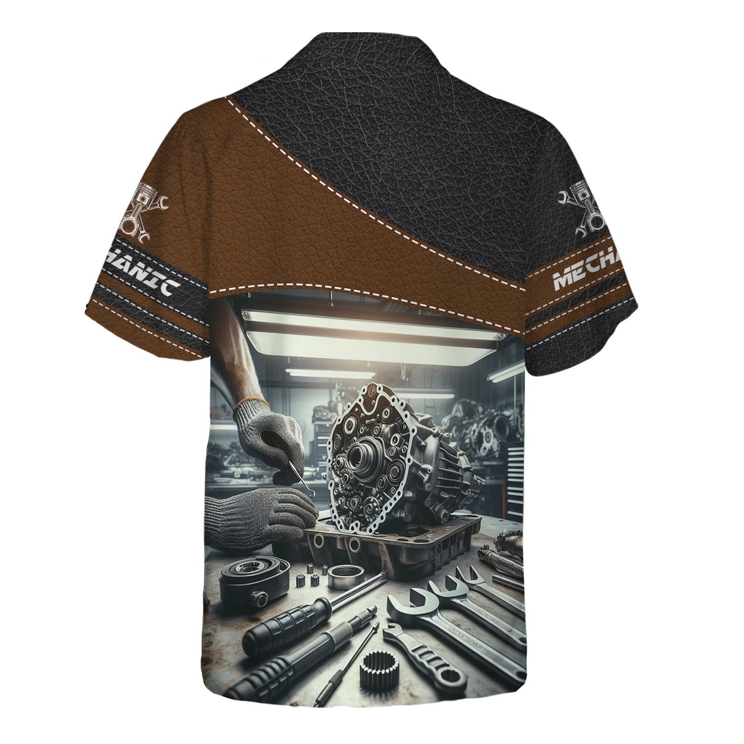 The print is awesome and the shirt fits just right. Perfect for any mechanic who loves bold style.