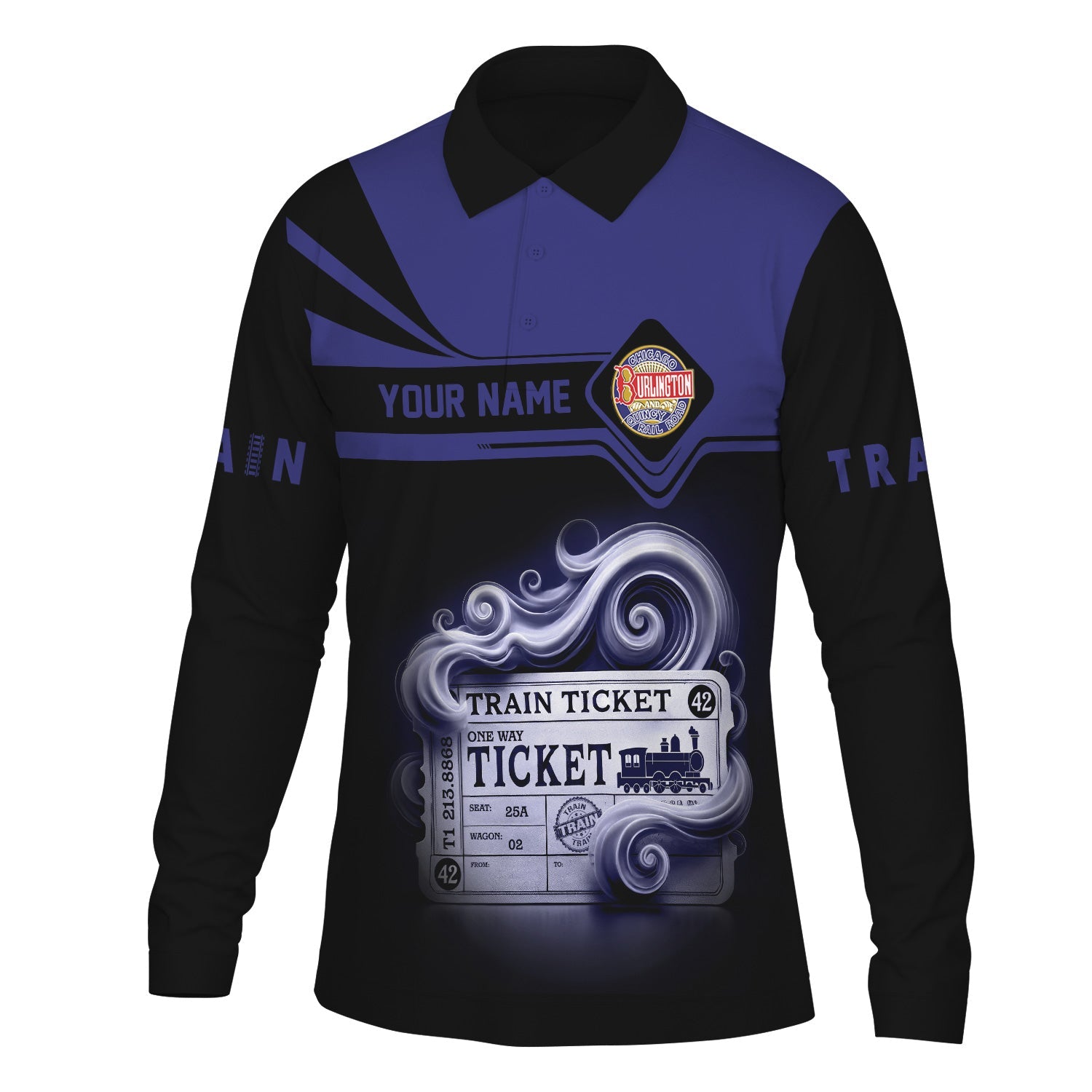 Railspirit Custom Name Chicago, Burlington and Quincy Railroad Long Sleeve Polo Shirt Train Ticket Printed Shirt