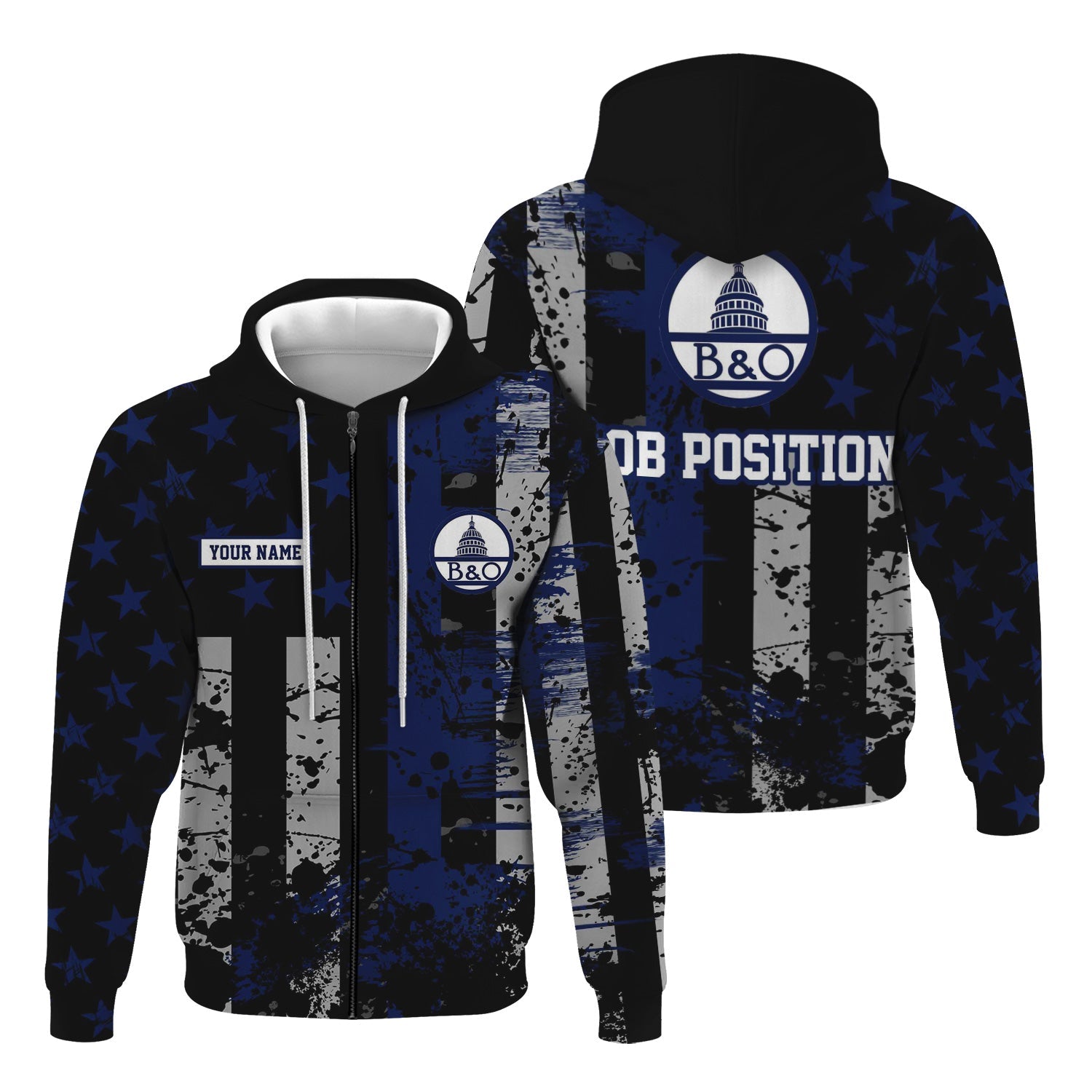 Railspirit Personalized Baltimore and Ohio Railroad Hoodie Artistic Paint American Flag Style B&O Train Zip Up Hoodie