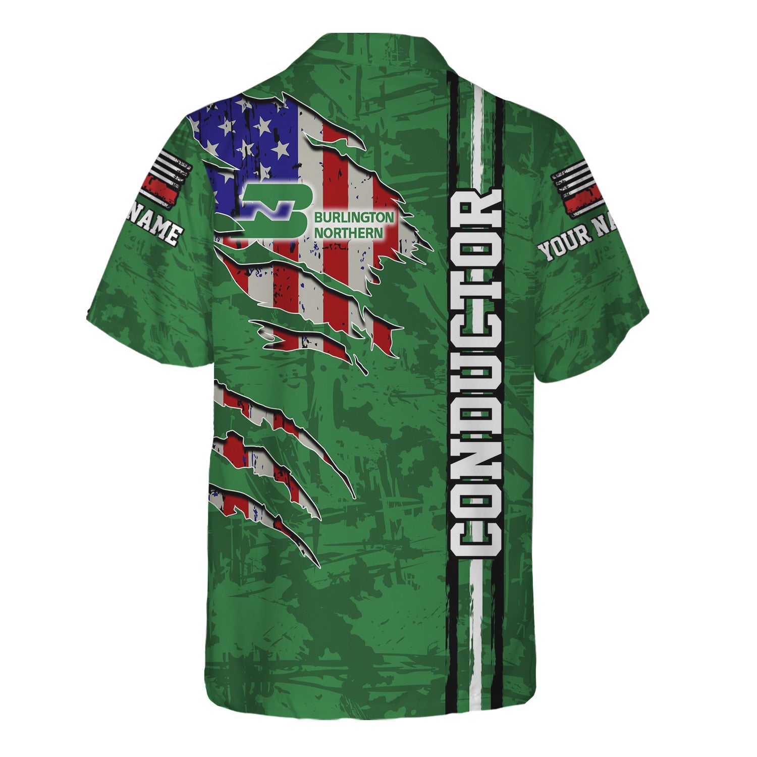 Railspirit Personalized Burlington Northern Railroad Hawaiian Shirt USA Flag Claw Art with Custom Job Train Shirt