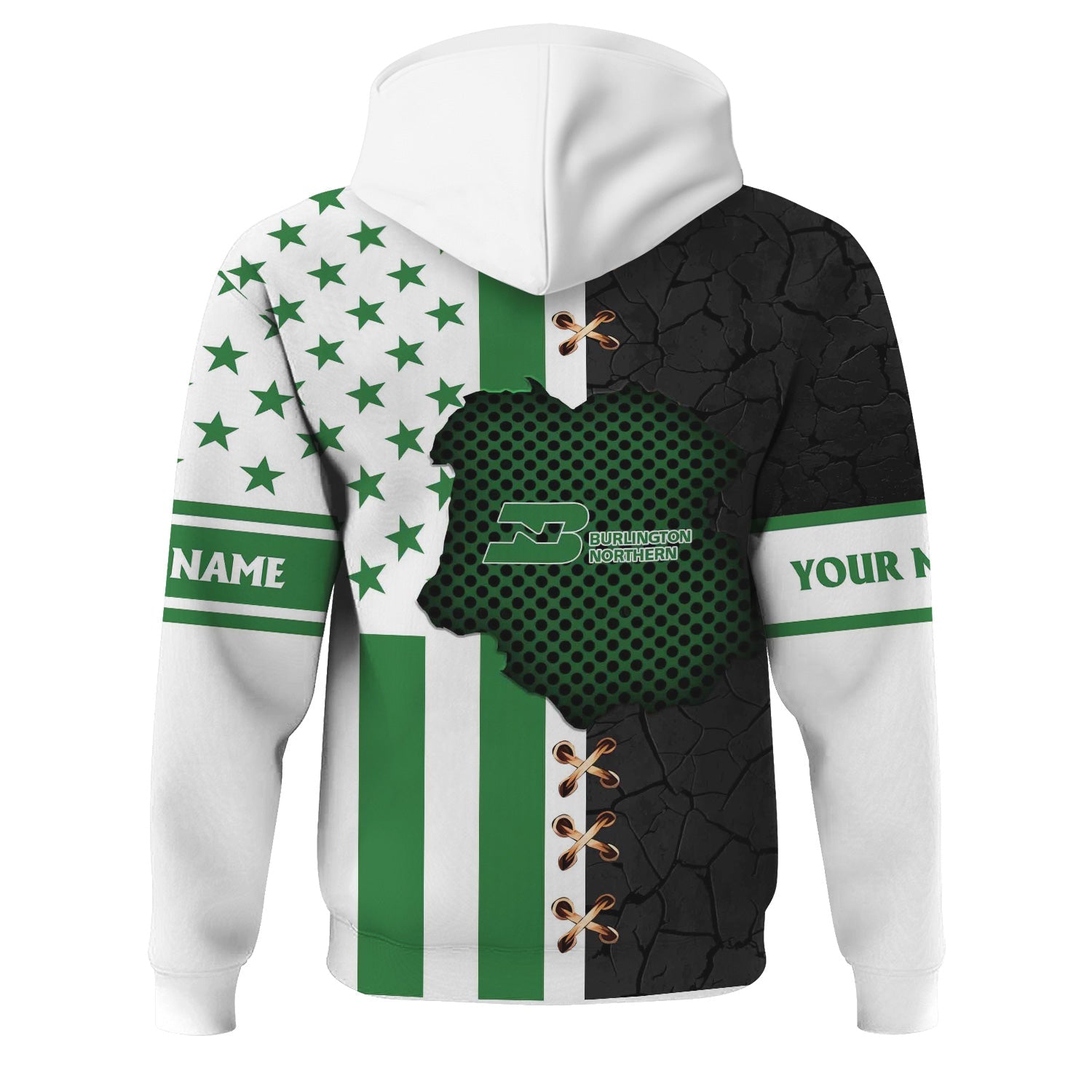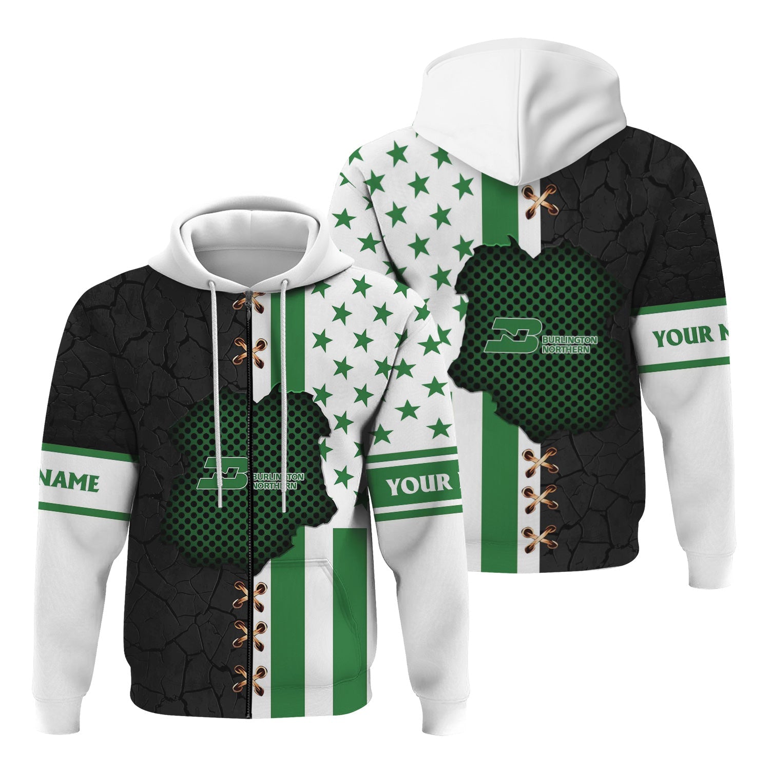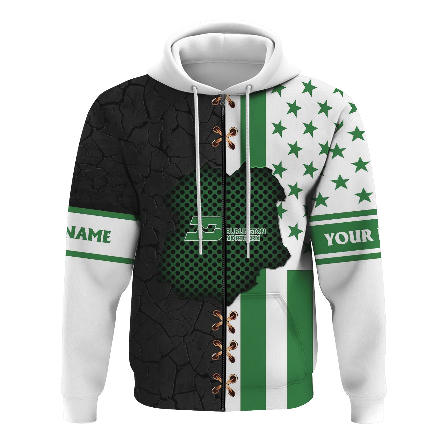Railspirit Personalized Burlington Northern Railroad Hoodie American Flag with Crack Effect Train Zip Up Hoodie