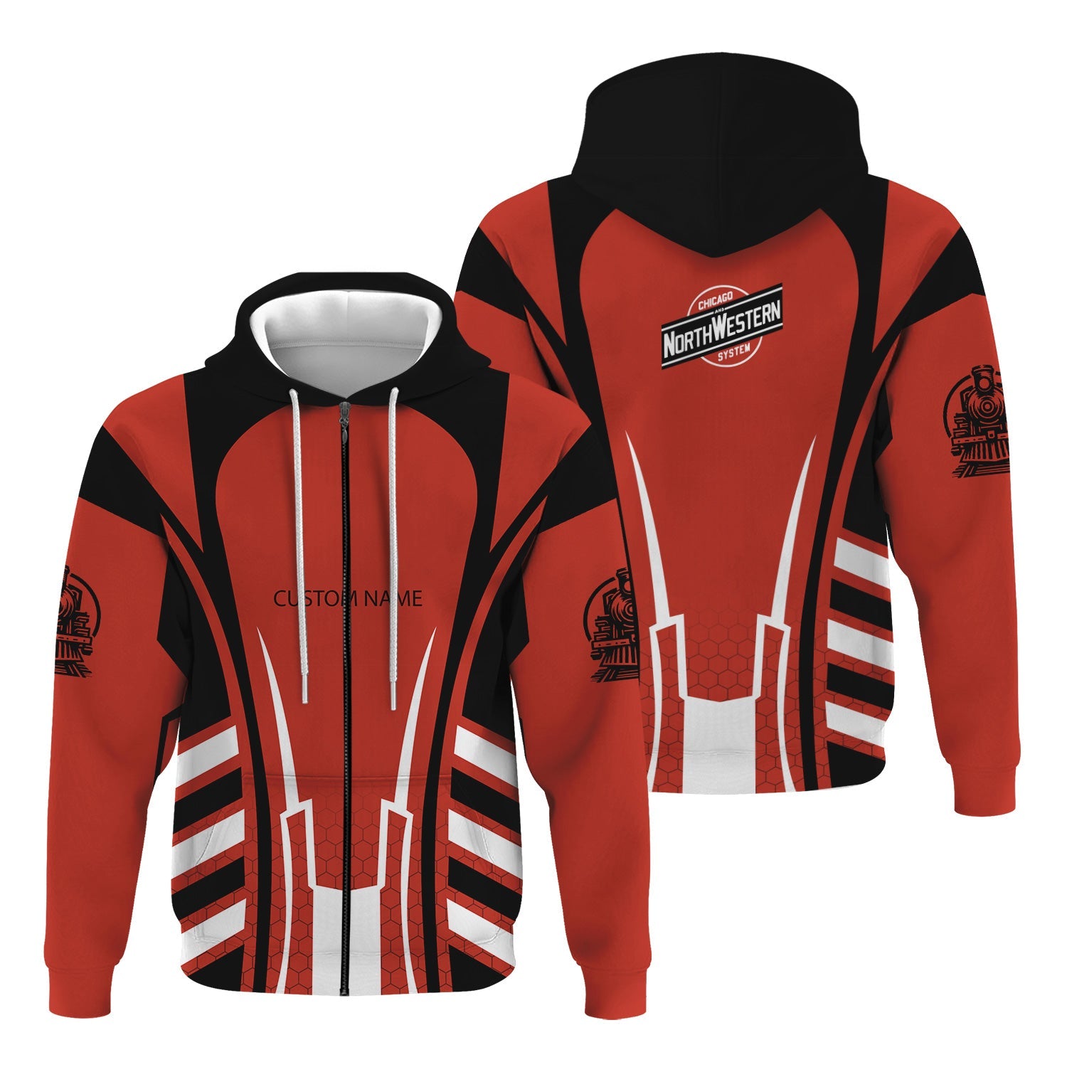 Railspirit Personalized Chicago and North Western Railway Hoodie Striped Railroad Style Train Zip Up Hoodie All Over Print