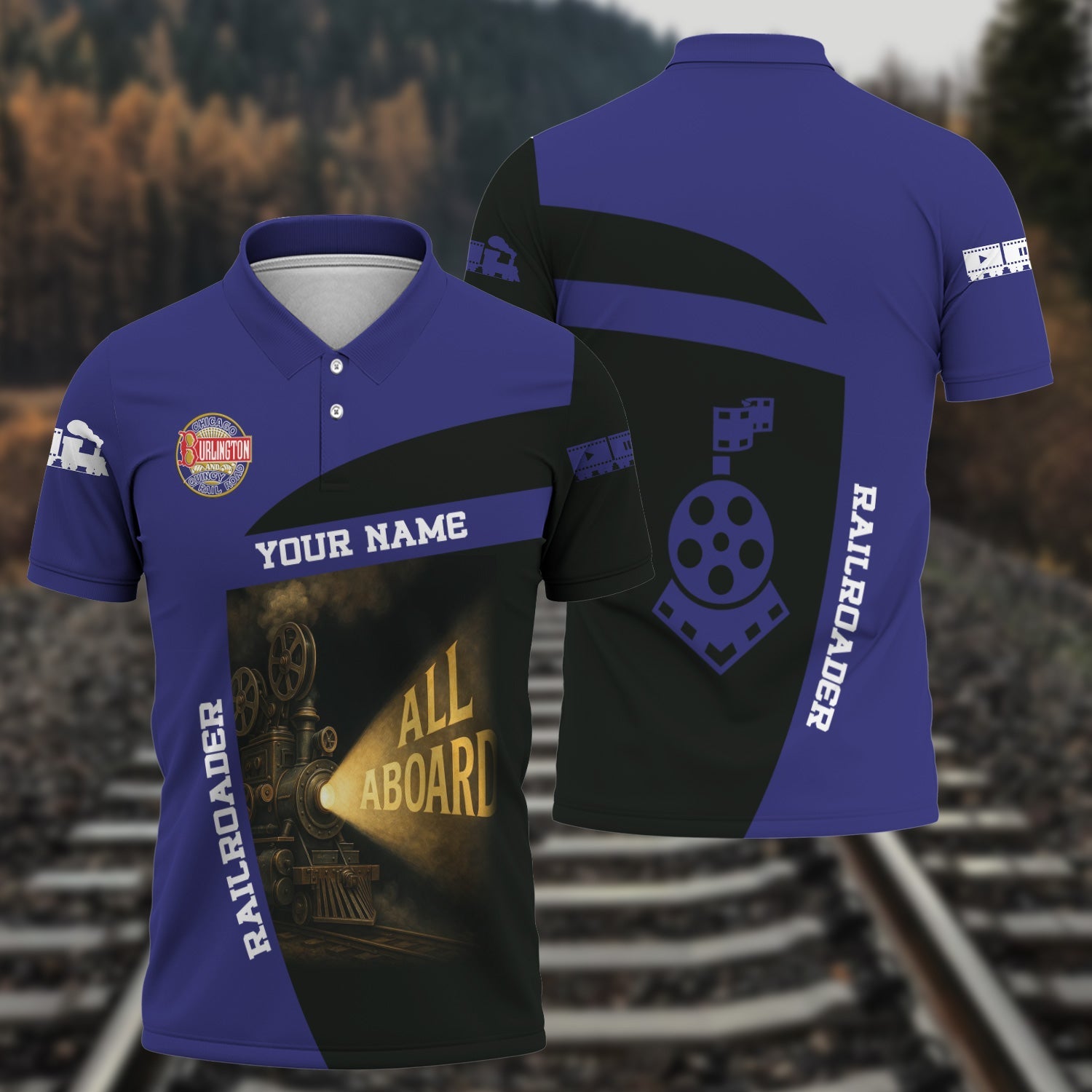 Railspirit Personalized Chicago, Burlington and Quincy Railroad Polo Shirt All Aboard Steam Train Movie Projector Style Shirt