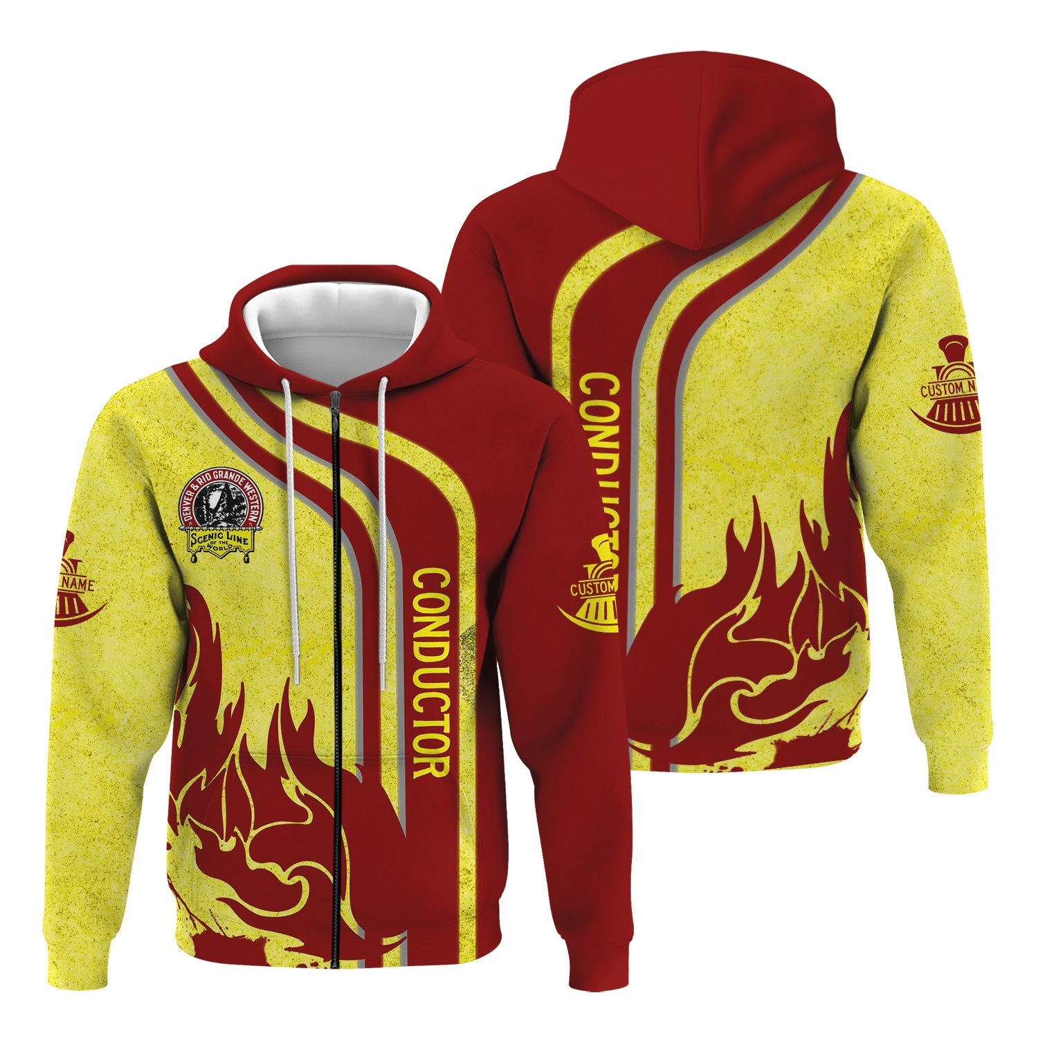 Railspirit Personalized Denver and Rio Grande Western Railroad Hoodie Flame Design with Custom Job Position Train Zip Up Hoodie