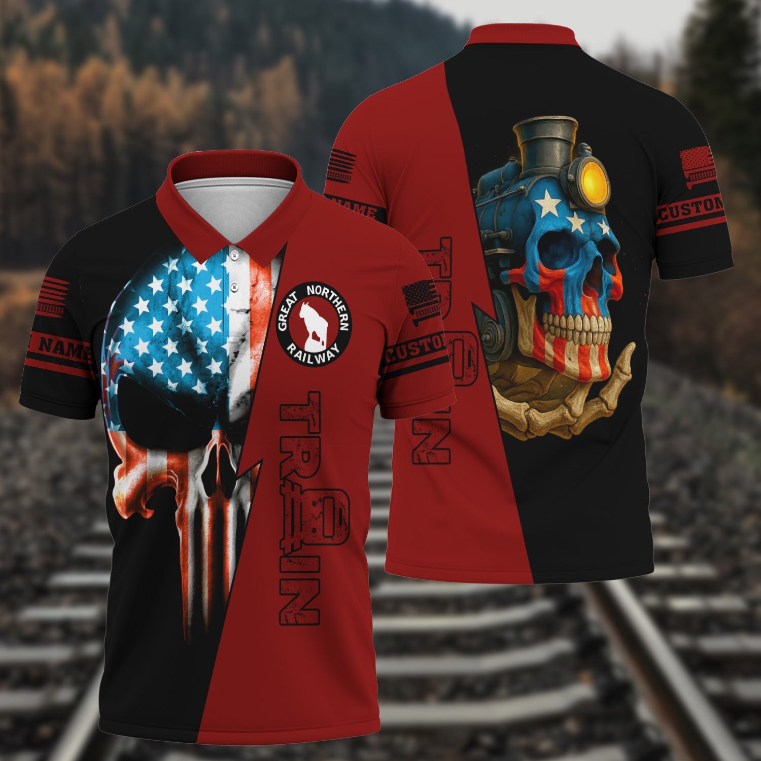 Railspirit Personalized Great Northern Railway Polo Shirt Train Skull American Flag GNR Shirt All Over Print