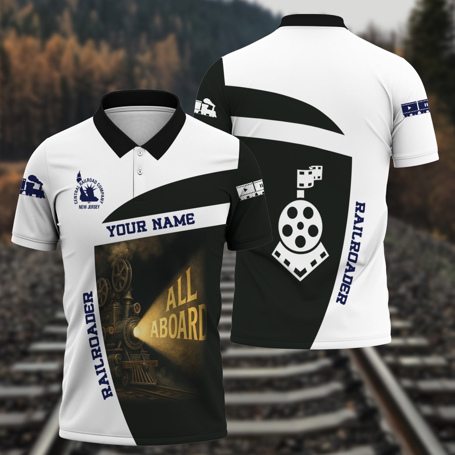 Railspirit Personalized Jersey Central Railroad Polo Shirt All Aboard Steam Train Movie Projector Style Shirt