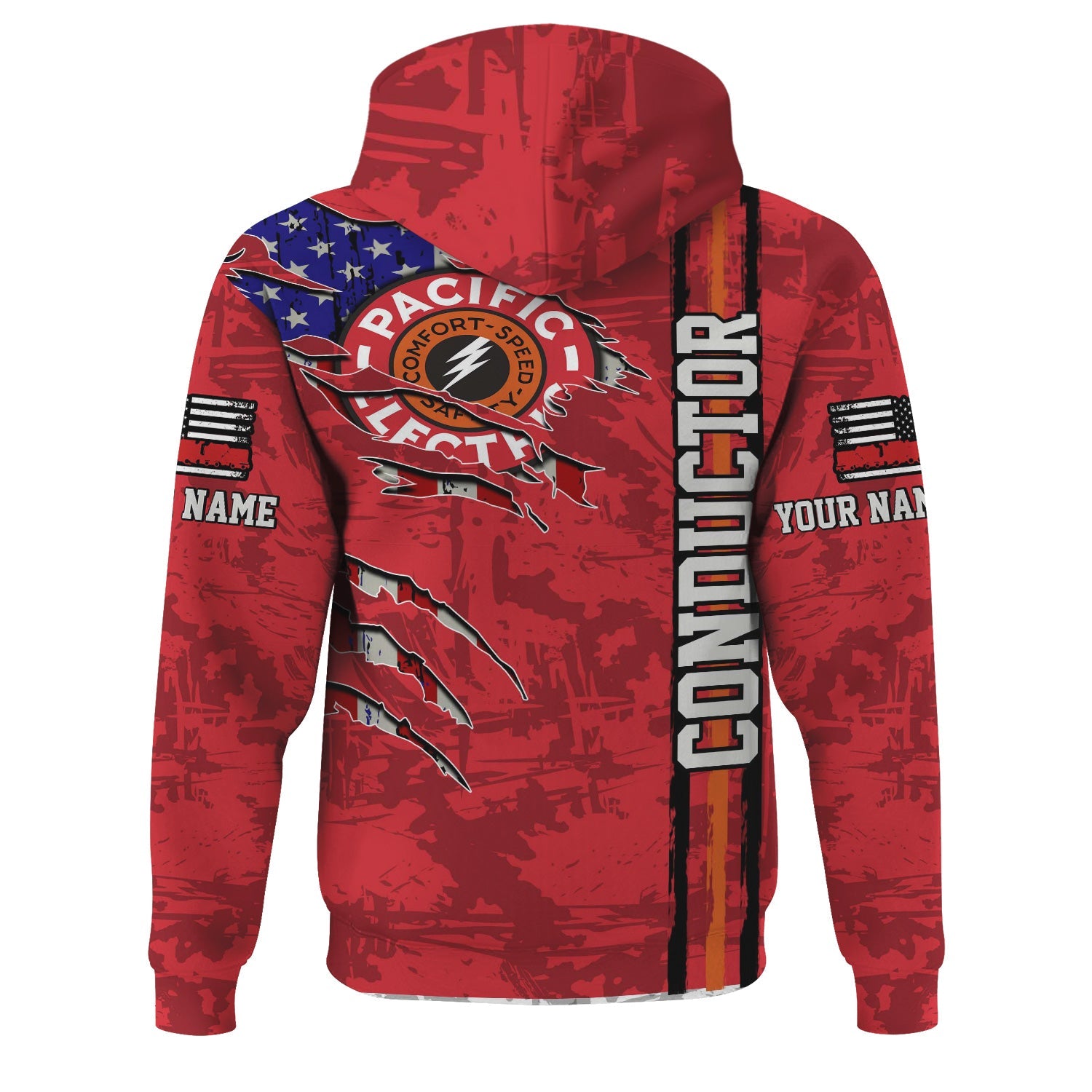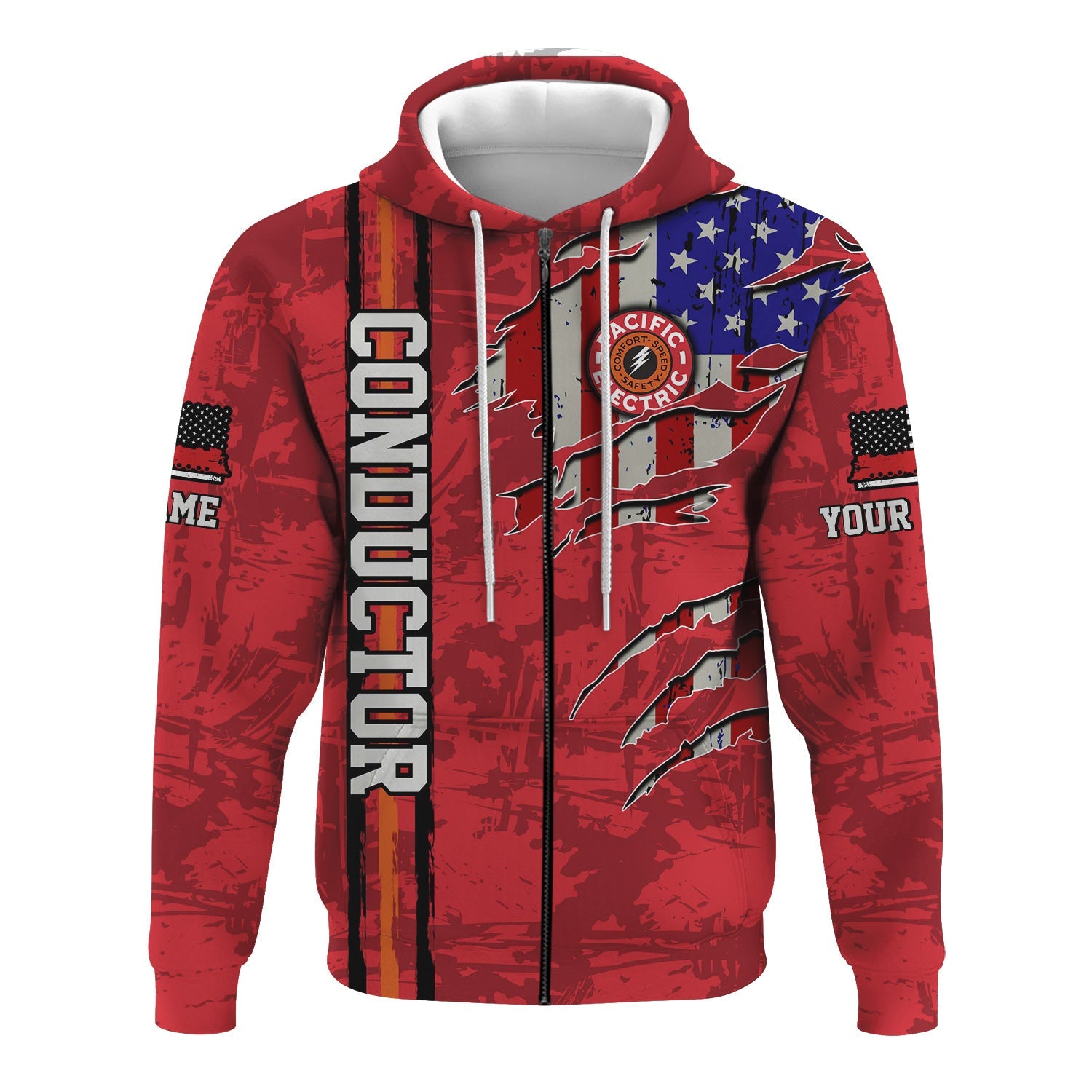 Railspirit Personalized Pacific Electric Railroad Hoodie USA Flag Claw Art with Custom Job Train Zip Up Hoodie