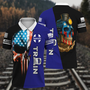 Railspirit Personalized Santa Fe Railway Polo Shirt Train Skull American Flag Atchison, Topeka and Santa Fe Railway Shirt All Over Print