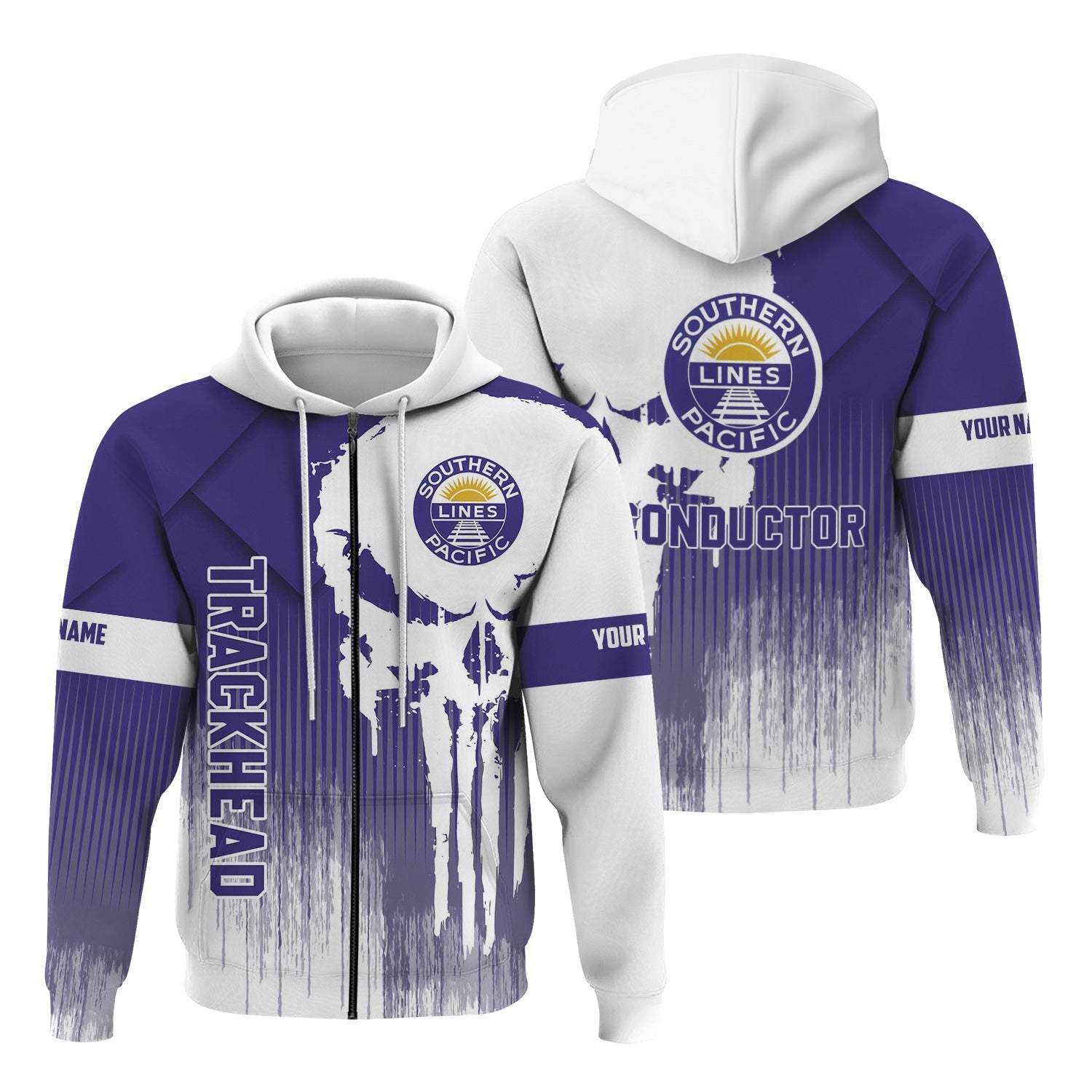 Railspirit Personalized Southern Pacific Railroad Hoodie Skull Design with Custom Job Train Zip Up Hoodie for Trackhead Crew