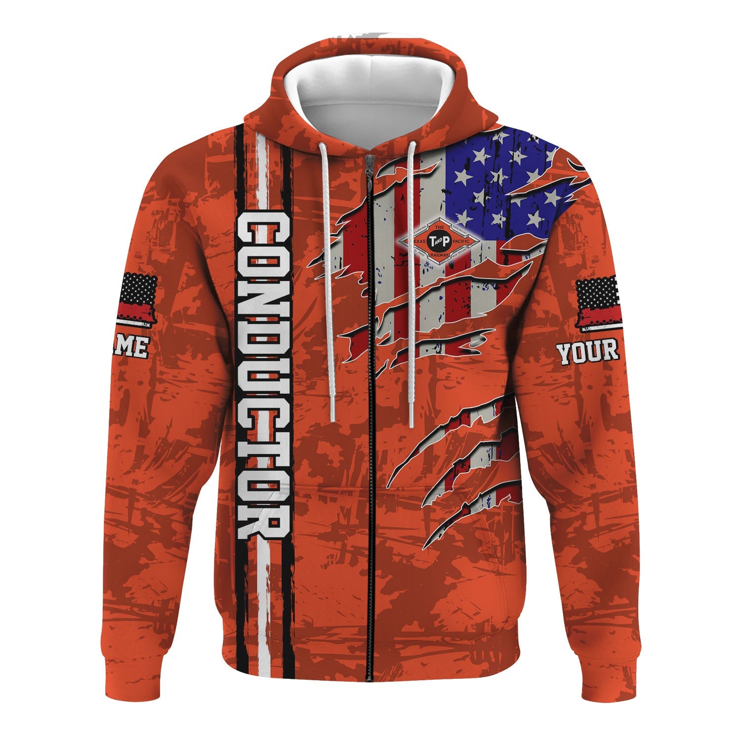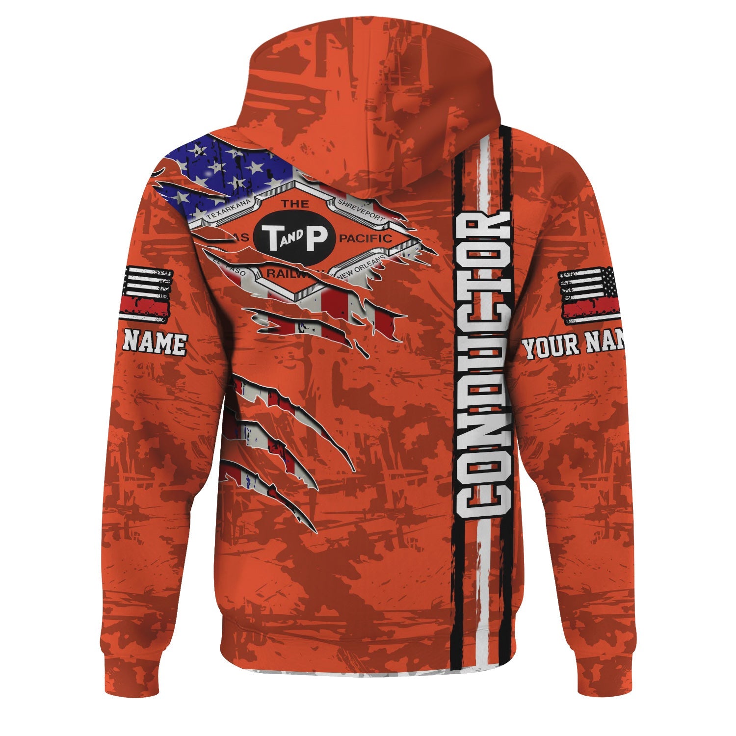 Railspirit Personalized Texas and Pacific Railway Hoodie USA Flag Claw Art with Custom Job Train Zip Up Hoodie