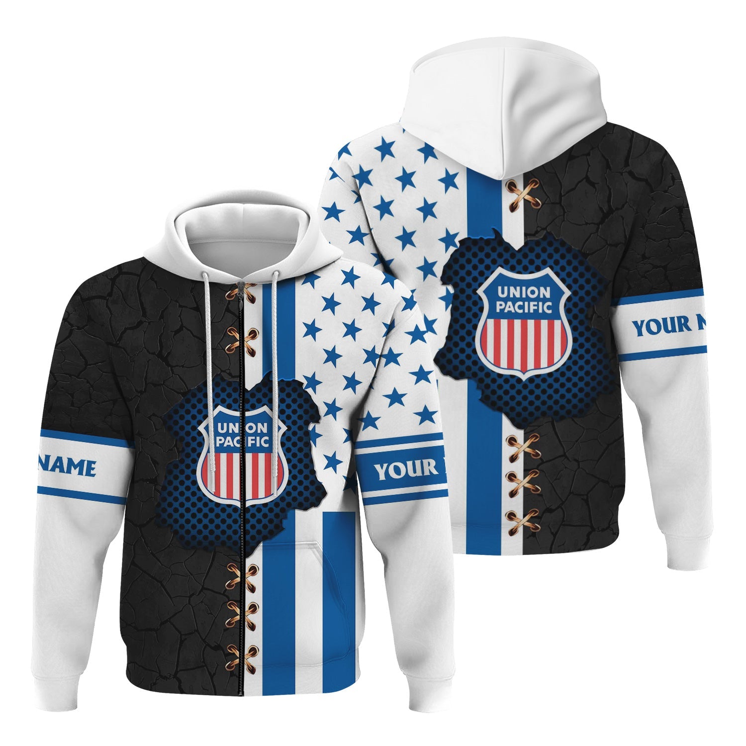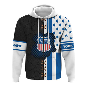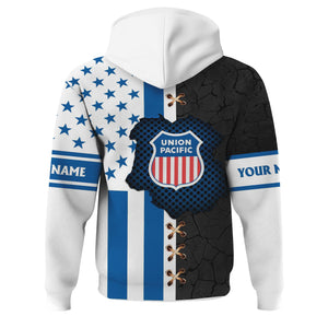 Railspirit Personalized Union Pacific Railroad Hoodie American Flag with Crack Effect Big Boy Train Zip Up Hoodie