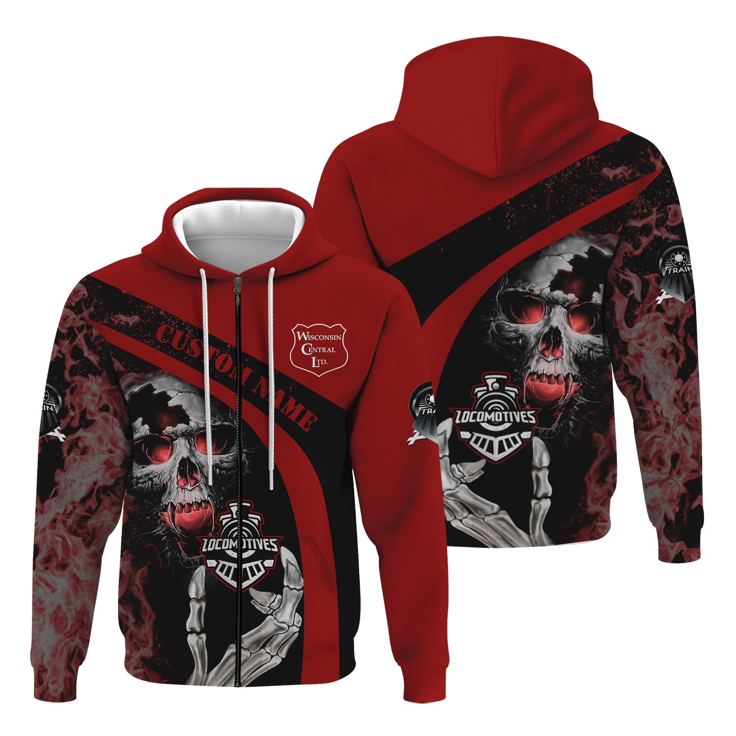 Railspirit Personalized Wisconsin Central Ltd Railroad Hoodie Flame Skull Design Train Zip Up Hoodie for Locomotive Fans