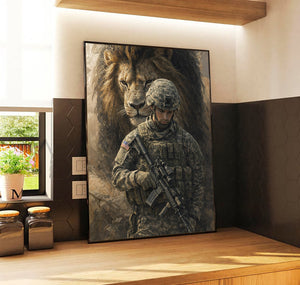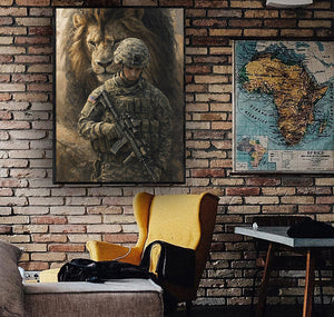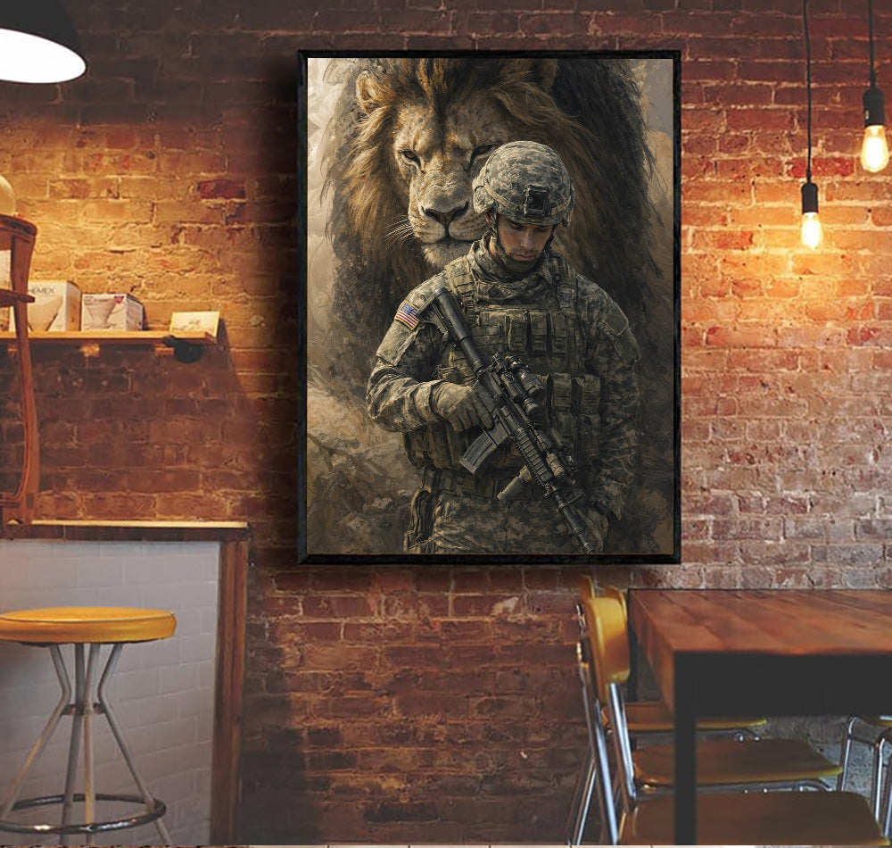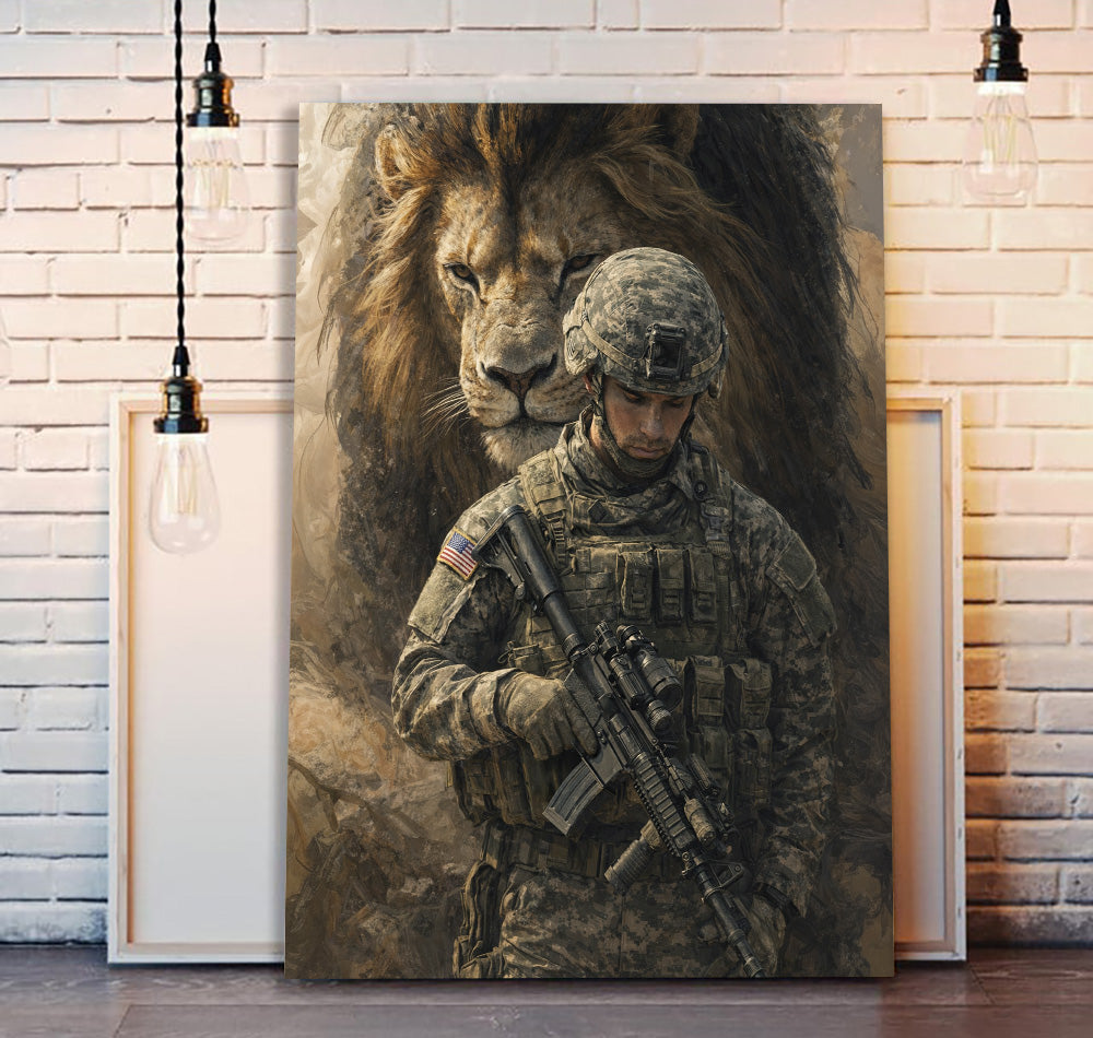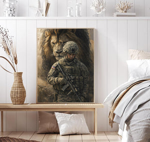 Soldier and Lion Canvas Wall Art, Patriotic Military Decor, Courage Strength Warrior Print, Veteran Gift, Home Artwork Decor