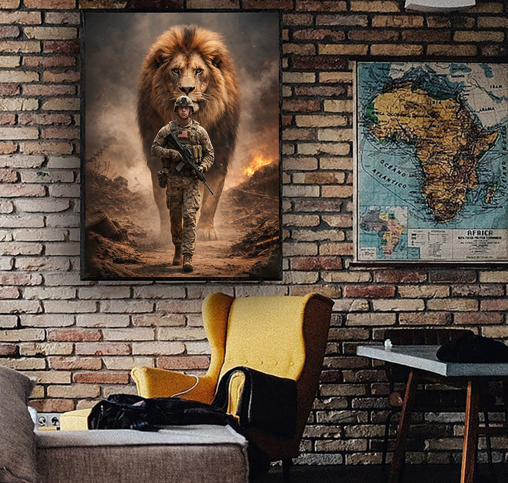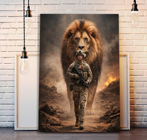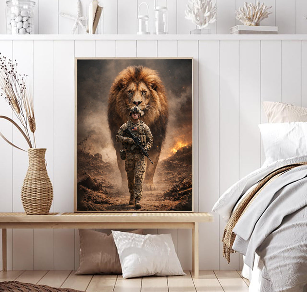 Soldier And Lion of Judah Canvas Jesus Canvas Wall Art, Christian Military Wall Art for Veterans, Faith Home Decor Gift