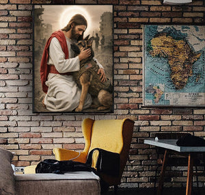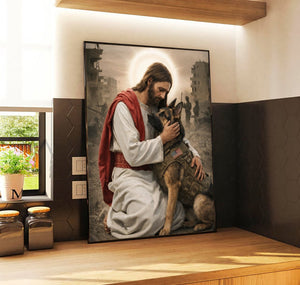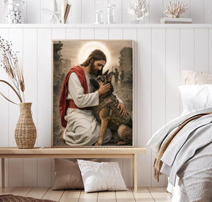 Soldier And Military Dog In Chaos Canvas Jesus Canvas Wall Art, Christian Military Wall Art for Veterans, Faith Home Decor Gift Idea