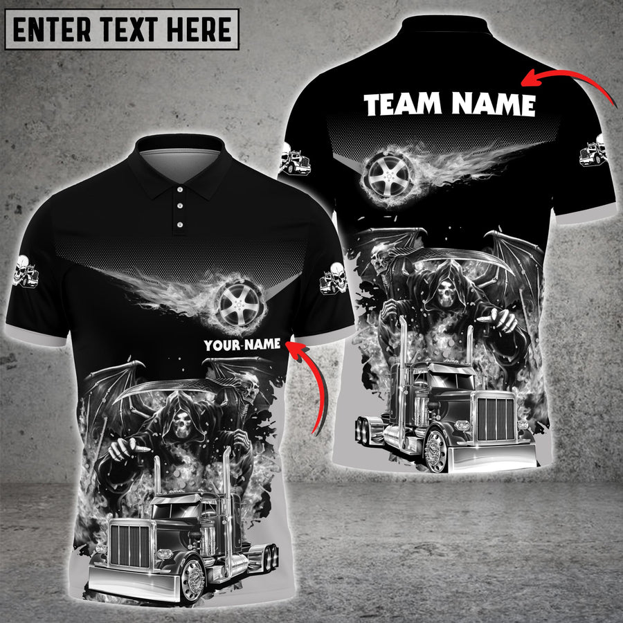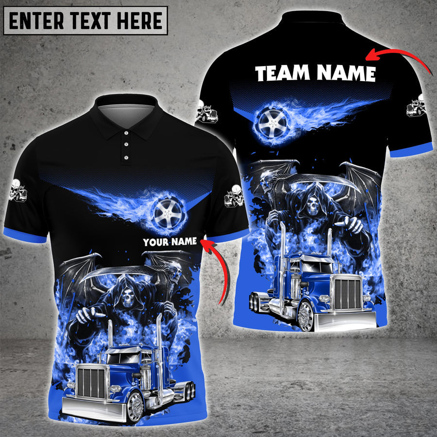 Personalized Name Truck Chasing Flame Skeleton Multicolor Polo Shirt, Gift For Truck Driver, Best Shirt For Trucker
